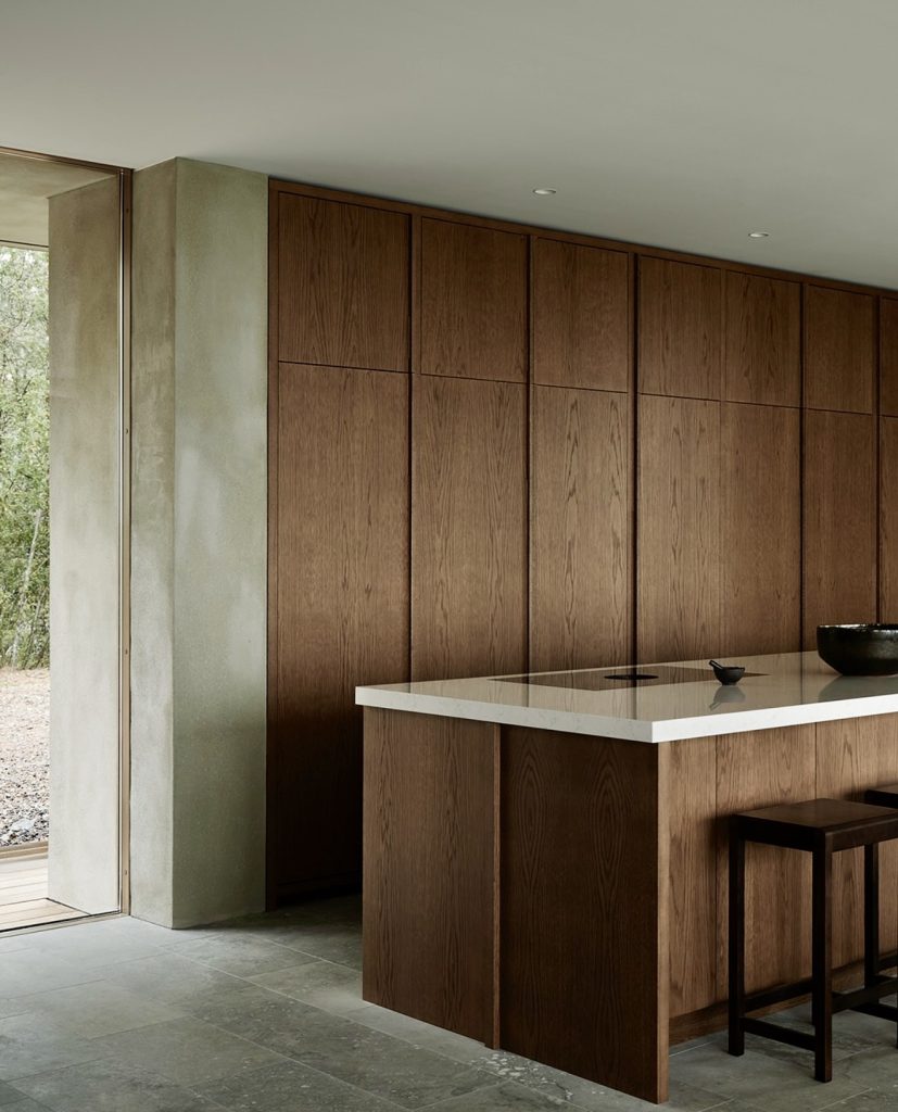 The kitchen evokes calmness through its continuous interplay with light wood, marble, and other organic materials. The cabinetry is elegantly simple, while the broad island is finished with luxurious veined stone. Delicate backlighting serves the dual purpose of softening the spa atmosphere and emphasizing the natural grains of the stone. The thin flooring, integrated shelving, and all other details are testaments to the luxurious restraint of design 2026. It is a Scandinavian modernity that is earthy, elegant, and elevated to timeless sophistication.