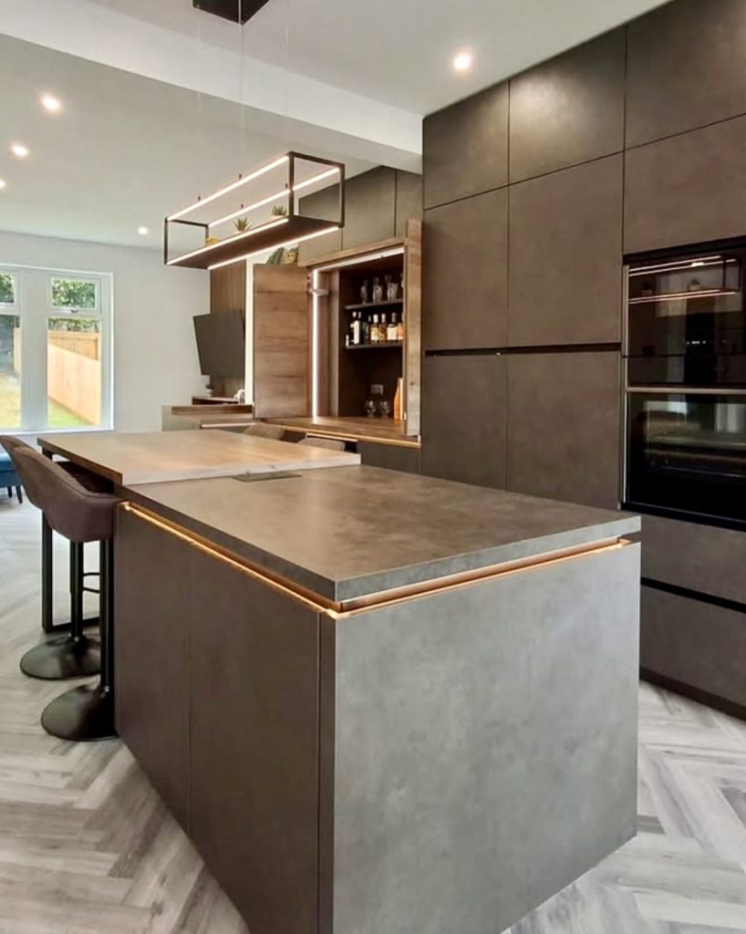 Sleek and dramatic, this kitchen captures the power of dark tones balanced with warm wood and subtle metallic lines. The matte finishes and geometric cabinet design define the ultra-modern look, while integrated lighting introduces an element of luxury. Hidden storage and a striking island layout emphasize functionality within clean design minimalism. Despite its boldness, the mood remains cozy, inviting, and undeniably sophisticated. This is the kind of space that defines modern kitchen ideas for 2026—confident, futuristic, and flawlessly balanced.