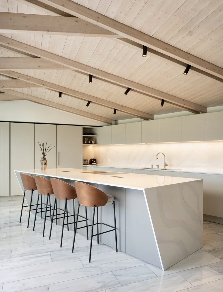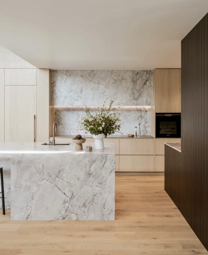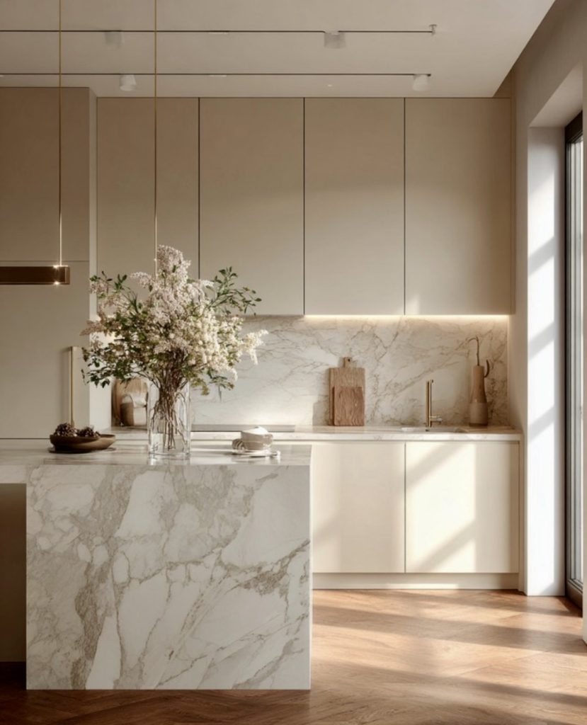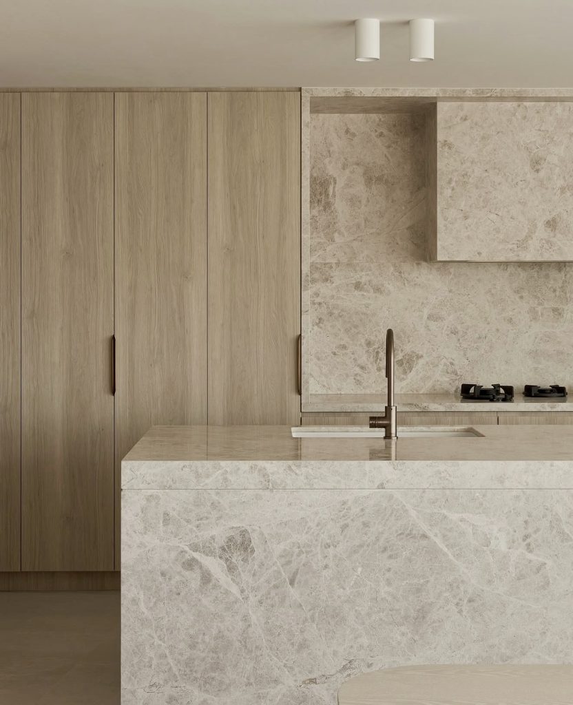 This serene kitchen highlights design luxury in 2026 through its use of tone-on-tone stone and soft oak finishes. The clean cabinet design eliminates visual noise, allowing the natural texture of marble to take center stage. With its organic materials and muted palette, the space feels effortlessly cozy yet undeniably modern. The island flows seamlessly into the countertop, creating a sculptural sense of unity. It’s a study in ultra-minimalism that proves simplicity can be the height of sophistication.