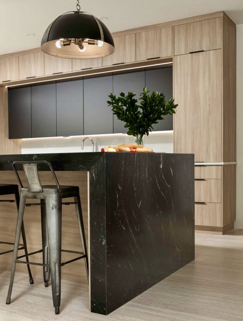 The design gets a modern industrial look from the combination of black detail, natural wood, and matte black elements. The boldness of the space is anchored with a dark marble island, which is a perfect contrast to the sleek cabinetry. Early mid-century design is alluded to in the bold light fixture and in the metallic structured and shiny stools. The warm tones and natural materials used offer a layer of coziness. This kitchen is a modern kitchen design that is both functional and in line with contemporary fashion.
