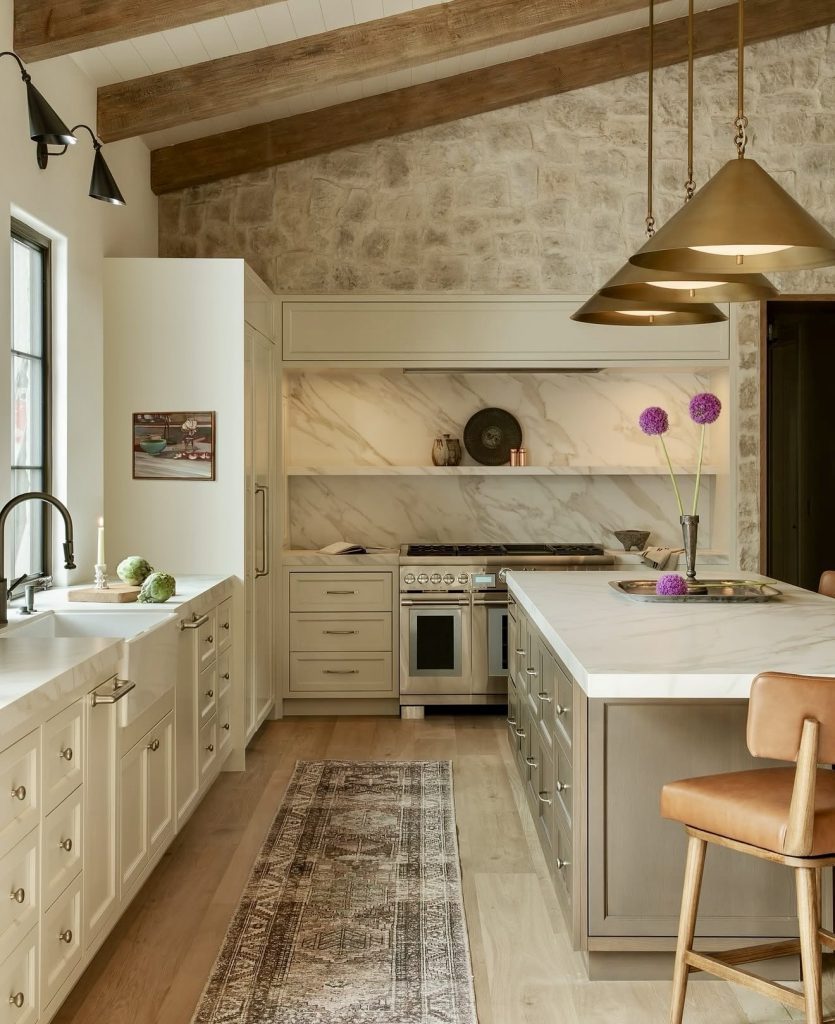 This space embraces rustic warmth and traditional charm while maintaining a sense of modern refinement. The stone wall, exposed beams, and marble counters come together in a masterful transitional design that feels authentically European. The brass fixtures and neutral palette add just enough luxury to balance its earthy roots. It’s a cozy, welcoming environment that feels effortlessly timeless. For homeowners who love old-world textures with a fresh 2026 sensibility, this kitchen is a perfect inspiration.