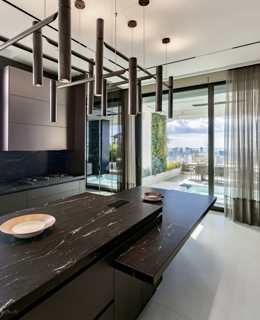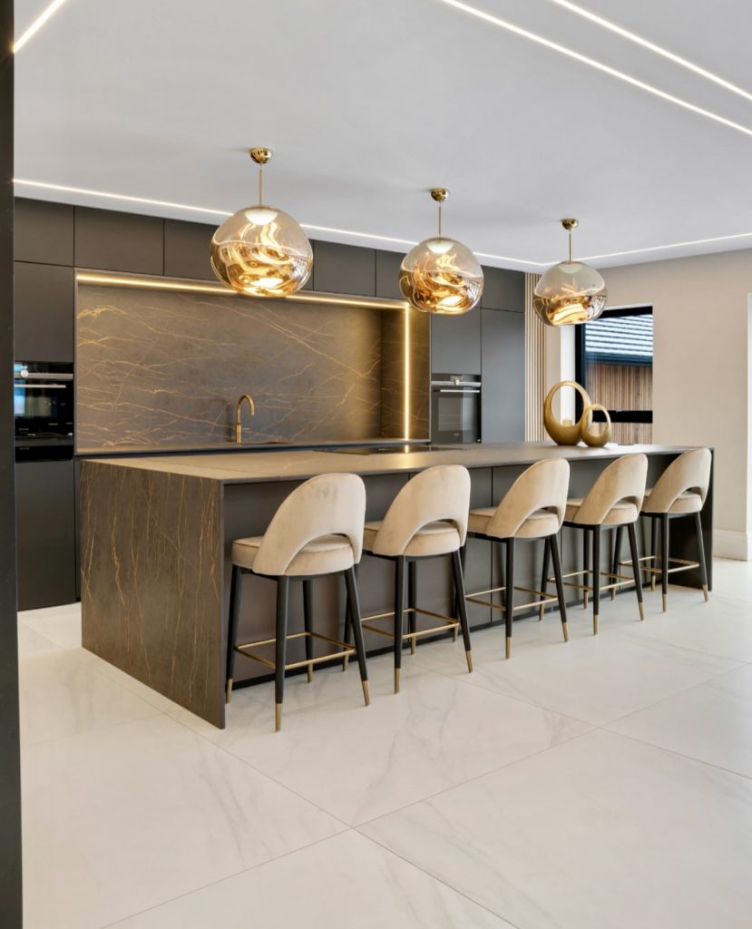 This dramatic black kitchen proves that dark interiors can still feel cozy and luminous. The ultra-sleek cabinet design and marble counters exude refined luxury, while the sculptural lighting acts as functional art. Floor-to-ceiling glass doors invite light, creating contrast and depth within the design. The modern island becomes a centerpiece for both dining and entertaining, merging beauty and practicality. This is luxury design 2026—bold, architectural, and irresistibly sophisticated.