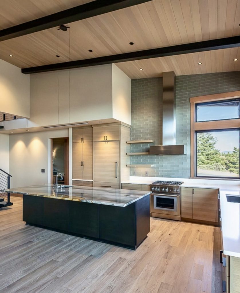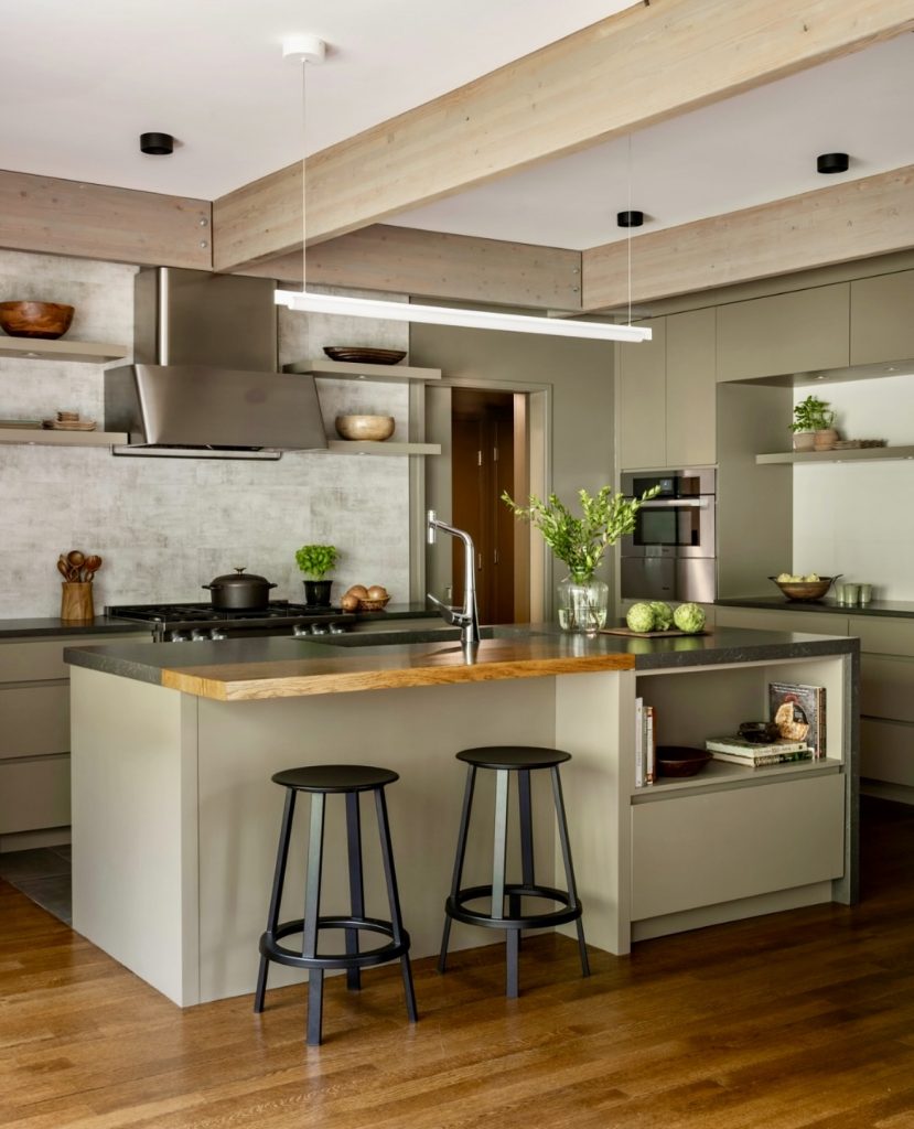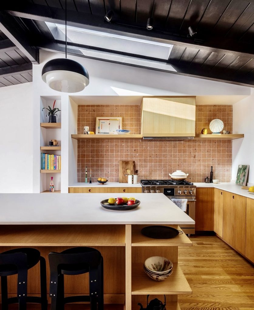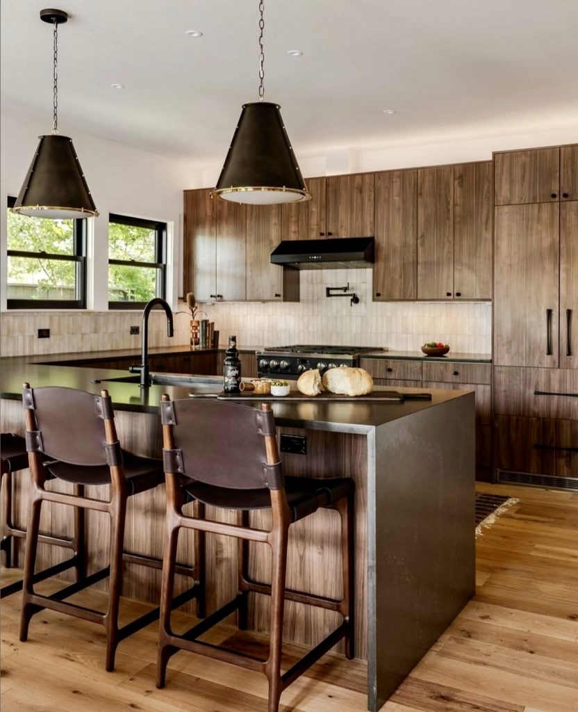 This kitchen fuses mid-century structure with industrial elements for a bold, architectural feel. The black island and steel accents contrast beautifully with warm wood tones, creating visual balance and personality. Overhead beams and natural light enhance the rustic yet refined atmosphere. The cabinet design embraces craftsmanship and geometry, reflecting a space both timeless and fresh. It’s a true reflection of modern kitchen ideas for 2026—confident, grounded, and beautifully authentic.