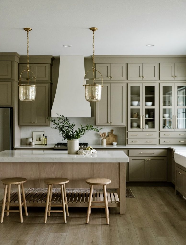 The taupe kitchen imparts transitional beauty with its calming and soft taupe cabinets, golden lighting, and warm wood textures. The cabinets feel traditional yet modern, and the space is simultaneously grounded and elegant. The open island evokes natural finishes that foster coziness and welcome. From the brushed hardware to the subtle greenery, every detail of Ache taps into earthy calm, a distinct echo of refined design luxury in 2026, timeless charm, and current grace.