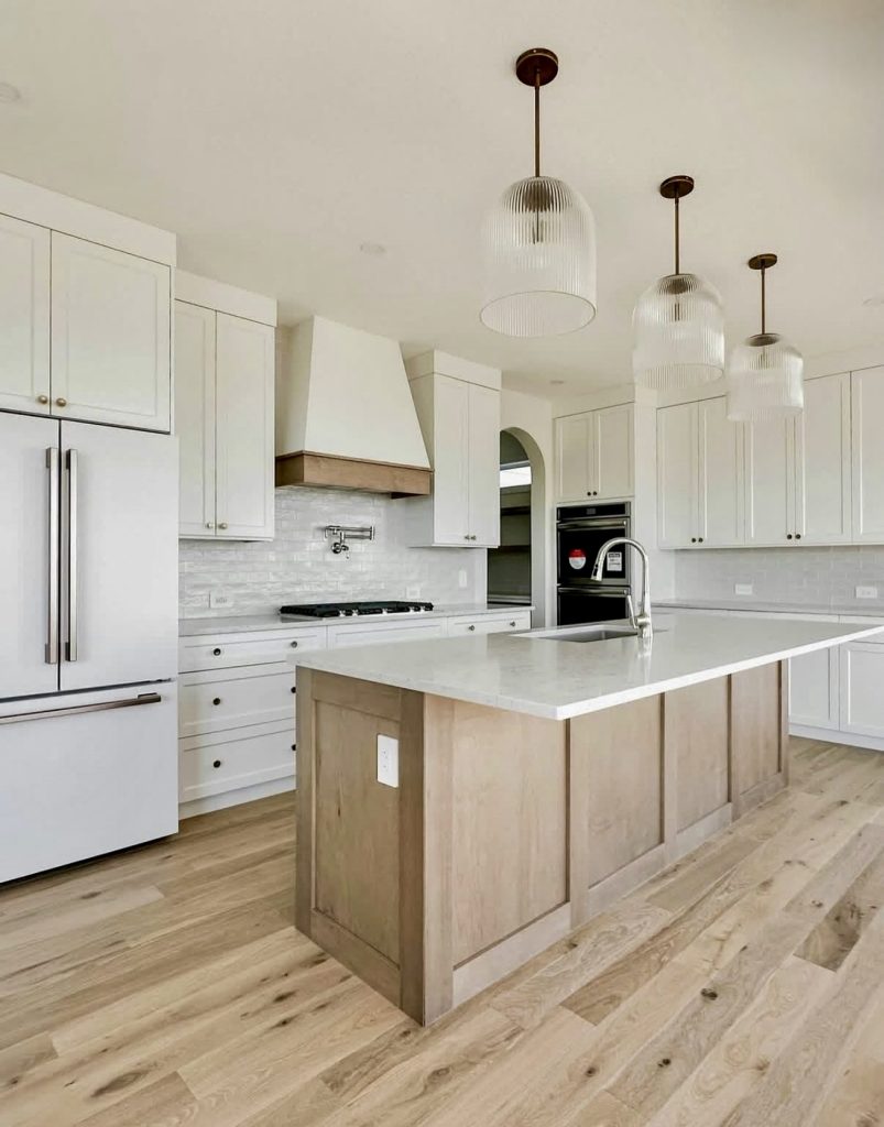 This bright, airy kitchen showcases white cabinetry paired with soft oak accents, embodying the simplicity of organic modern design. The cabinet design highlights craftsmanship and proportion, while the light flooring adds a breezy, coastal appeal. Brass fixtures and glass pendants introduce subtle luxury without overwhelming the clean aesthetic. The island serves as both workspace and gathering point, emphasizing function and elegance. This is the essence of modern kitchen ideas for 2026—simple, luminous, and effortlessly cozy.