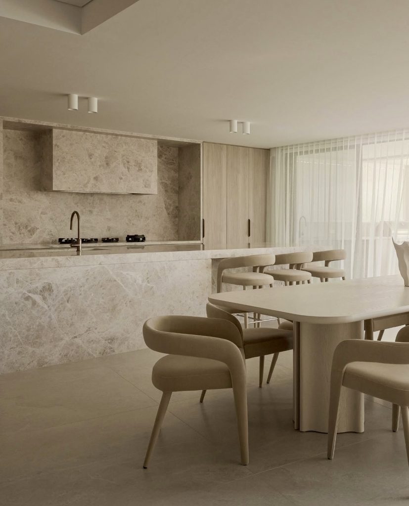 This open-plan kitchen celebrates organic materials and light-filled design. The stone island and matching backsplash create a unified look, while the soft beige tones enhance the feeling of calm. Smooth cabinet design with integrated handles maintains a minimalist rhythm that feels luxurious yet livable. Every curve and surface speaks to the art of quiet refinement. It’s a perfectly cozy example of understated elegance meeting functional beauty.