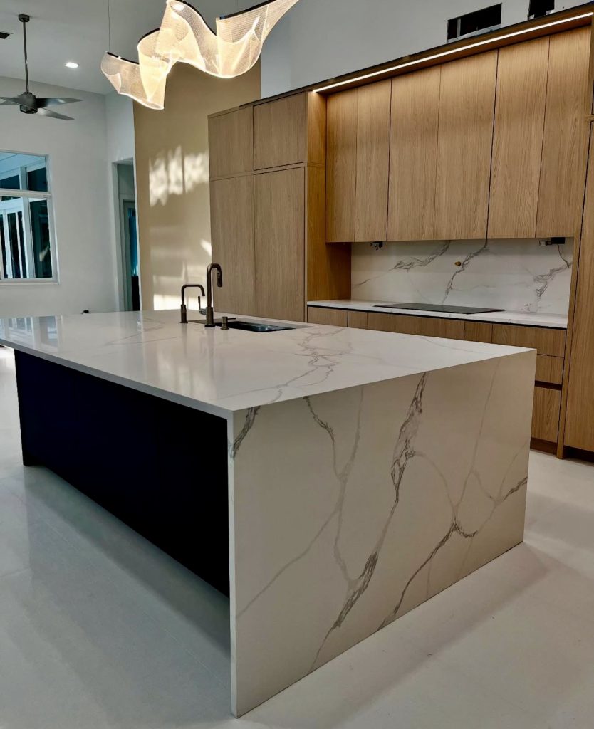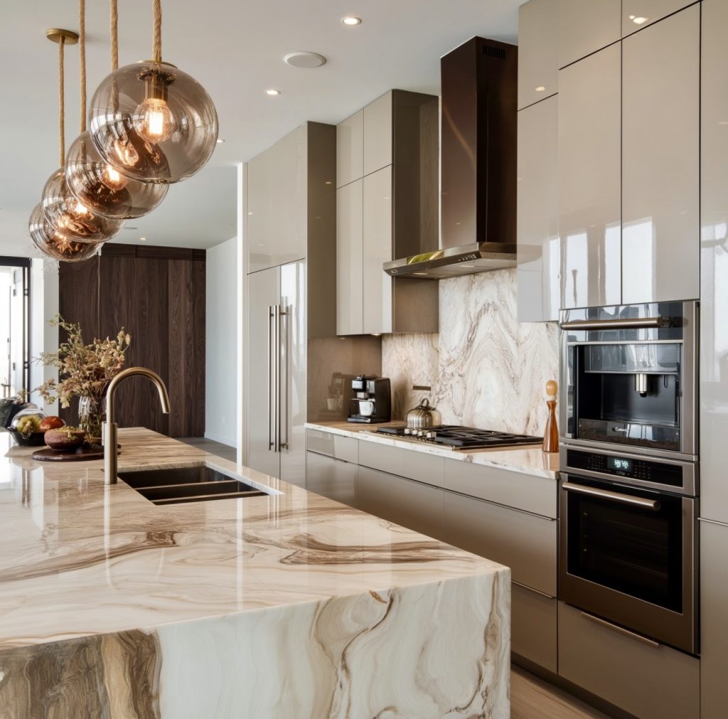 A bold marble island defines this kitchen’s modern elegance, balanced by natural wood cabinets and sculptural lighting. The design achieves harmony between sharp geometry and organic texture, proving that opposites can beautifully coexist. Soft lighting adds depth and luxury, creating an inviting, gallery-like atmosphere. Every element feels intentional—from the sleek faucet to the glowing backsplash. This space captures the quiet confidence of design luxury in 2026, refined and effortlessly stylish.