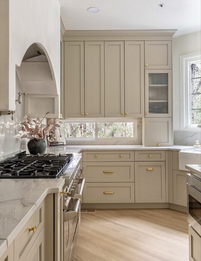 Here, a muted palette of taupe cabinets and brass hardware transforms tradition into something unmistakably modern. The cabinet design nods to midcentury craftsmanship, while marble countertops add an element of luxury and light. With its smart corner layout and earthy undertones, the kitchen feels both cozy and elevated. The subtle metallic accents tie together the classic and contemporary with effortless grace. It’s a design that bridges generations—timeless, balanced, and full of quiet sophistication.