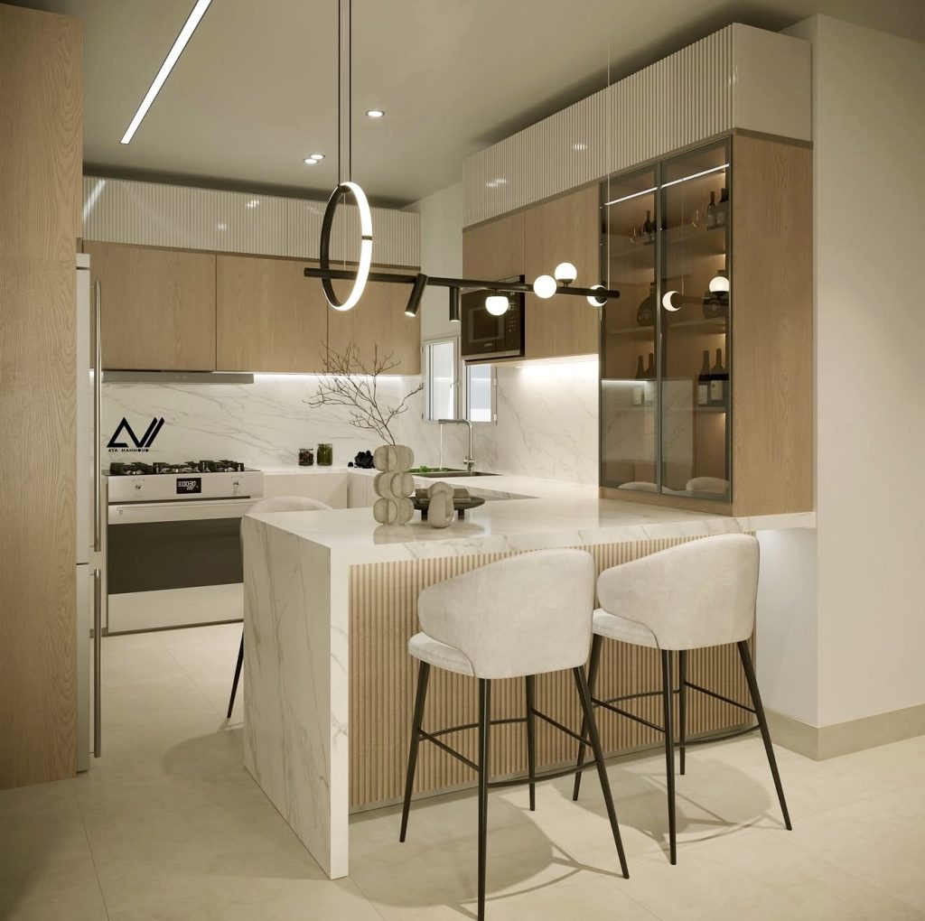 This kitchen proves that small spaces can still achieve design luxury through thoughtful cabinet design and subtle materials. The combination of light oak panels, fluted textures, and marble surfaces feels organic, refined, and perfectly cozy. Floating cabinets and soft illumination enhance the sense of space while preserving functionality. Black fixtures and minimalist lighting add just the right amount of modern edge. The result is a coastal-inspired retreat that radiates balance, warmth, and sophistication—a true reflection of modern kitchen ideas in 2026.