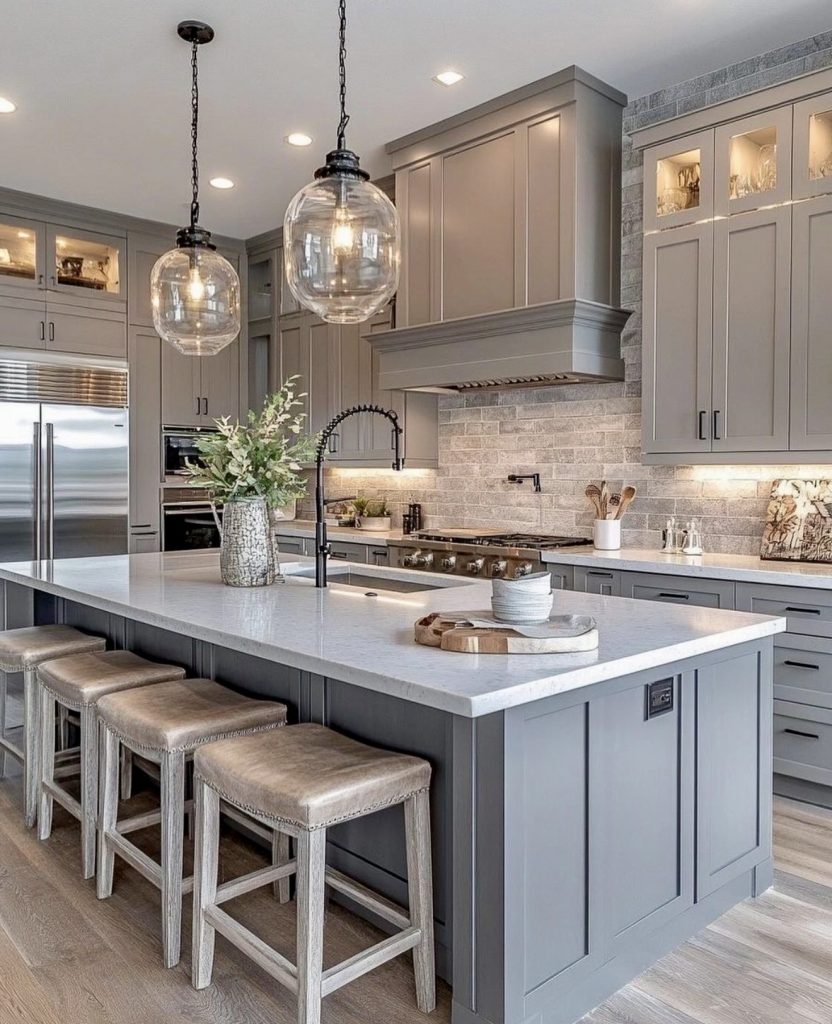 This kitchen captures a sense of luxury through its monochromatic palette of dark grays and layered cabinet design. Oversized glass pendants create a soft glow over the island, adding an inviting cozy warmth to the sleek surfaces. The traditional shaker-style cabinets merge seamlessly with modern finishes, reflecting a refined transitional aesthetic. Subtle earthy undertones from the stone backsplash balance the structured layout. It’s a timeless look that proves luxury design in 2026 can be both sophisticated and deeply livable.