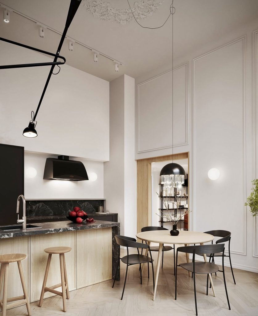Balancing black accents with organic light wood tones, this kitchen exudes Scandinavian calm with a modern twist. The minimalist design allows texture and shape to shine, from the marble-veined countertop to the sculptural lighting. The coastal-inspired wood chairs and round dining table make the space effortlessly cozy and social. Its cabinet design showcases functionality wrapped in subtle elegance—proof that simplicity never goes out of style. This interior redefines modern kitchen ideas for 2026, celebrating minimalism that still feels warm and welcoming.