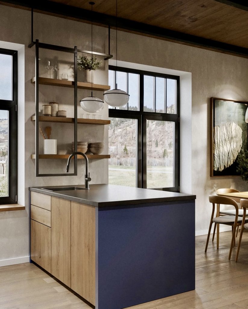 This kitchen pairs rustic materials with modern geometry, achieving a balance that feels refreshingly organic and grounded. The combination of open shelving and matte wood cabinets reflects the rise of mid-century influence with industrial flair. Black framing and metal details add retro character, while the blue island injects unexpected personality. Large windows flood the room with light, highlighting the raw textures of wood and steel. It’s the perfect design for anyone who loves the authenticity of natural materials with a modern edge.