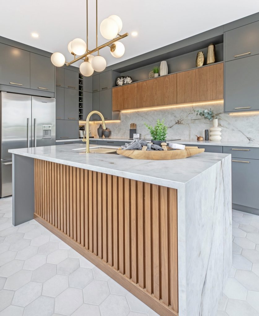 Luxurious design meets functionality in the form of a sculptural island encased in gray marble with fluted oak panels. Charcoal gray sleek cabinet design adds contrast while achieving an earthy balance. Brass fittings and geometric lighting evoke a hint of mid-century glamour and soften the clean lines with visual warmth. The palette feels both coastal and classic, reflecting the universal appeal of understated sophistication for U.S. homeowners. This is modern kitchen design at its most harmonious: bold yet beautifully livable.