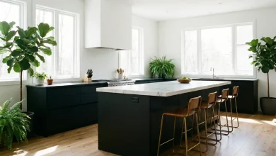 This dramatic black kitchen proves that dark interiors can still feel cozy and luminous. The ultra-sleek cabinet design and marble counters exude refined luxury, while the sculptural lighting acts as functional art. Floor-to-ceiling glass doors invite light, creating contrast and depth within the design. The modern island becomes a centerpiece for both dining and entertaining, merging beauty and practicality. This is luxury design 2026—bold, architectural, and irresistibly sophisticated.