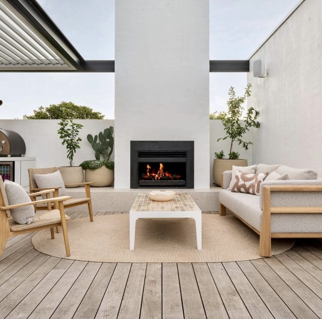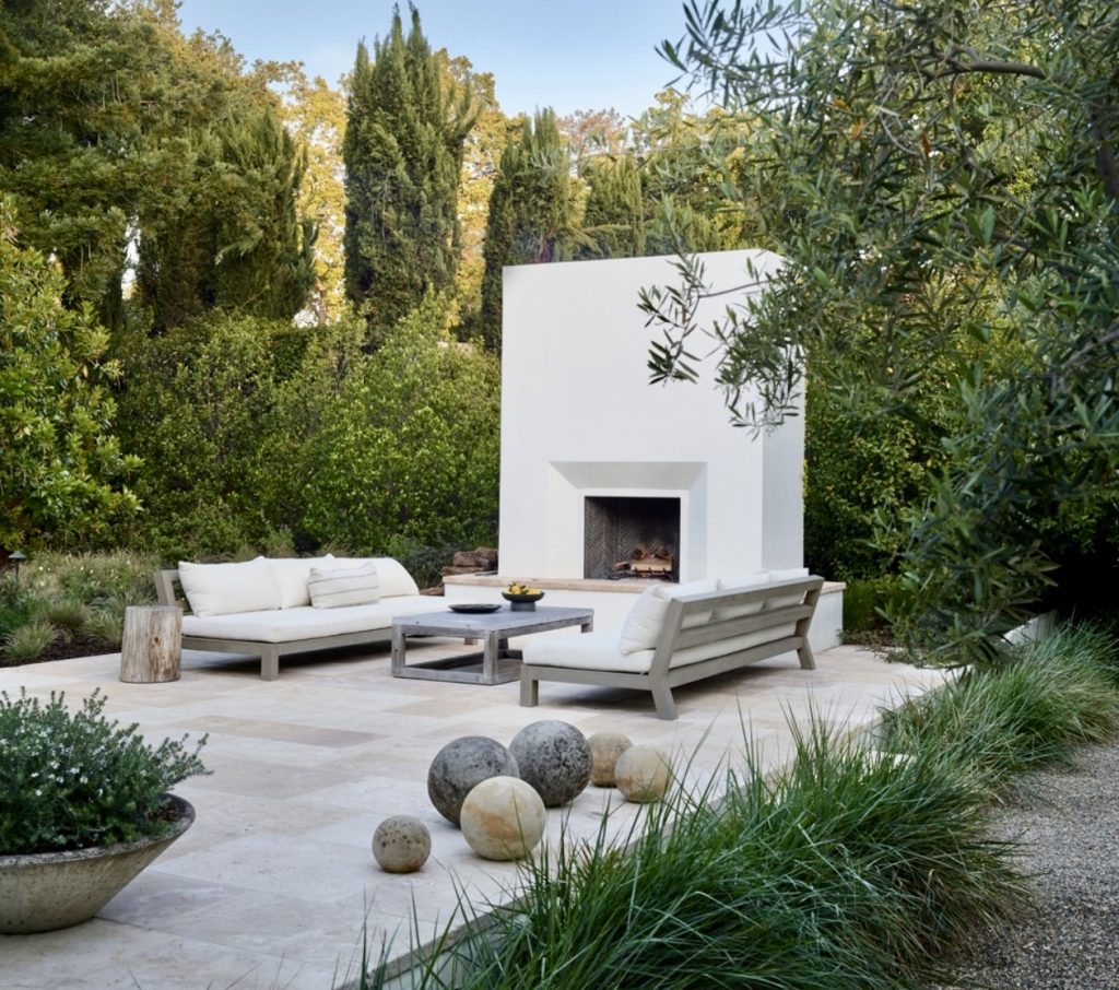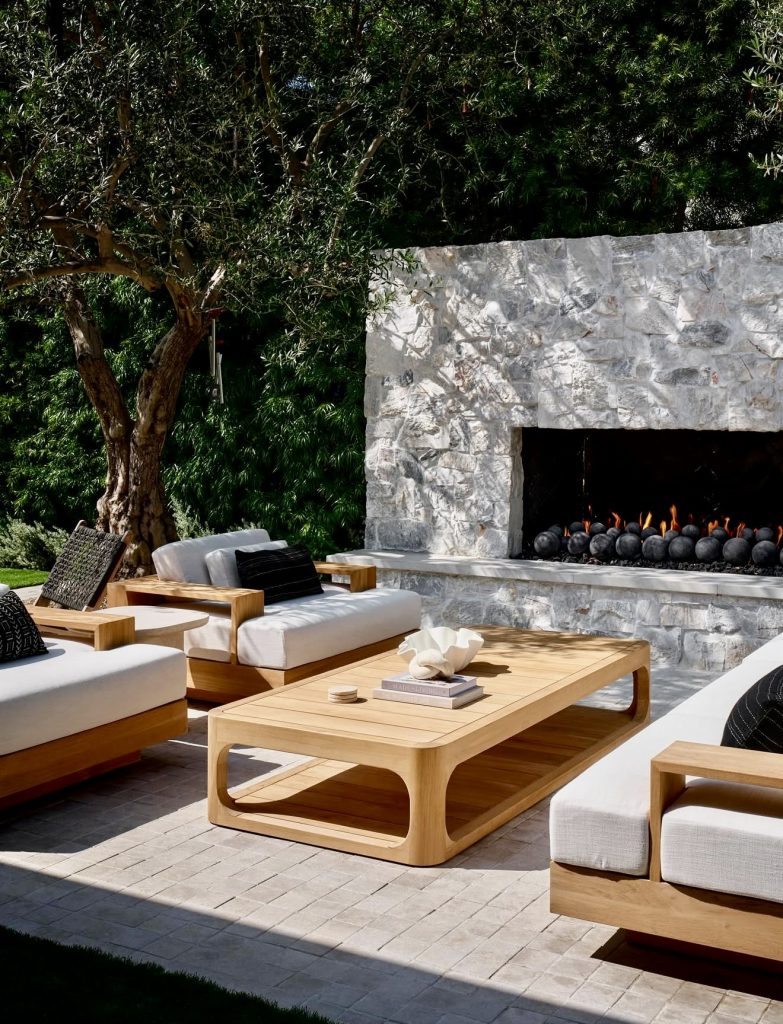 Few outdoor designs feel as refined as this contemporary fireplace framed in pale stone. The smooth stone finish paired with sculptural black fireballs creates a dramatic yet elegant statement. Surrounded by warm wood-framed loungers with crisp white cushions, the setting balances luxury with relaxation. This fireplace would look equally at home in high-end resorts or private backyards, proving that unique design doesn’t have to feel overcomplicated. It’s also worth noting that this type of fireplace works beautifully with gas, ensuring both easy use and clean lines. With the right styling, this becomes less of a fireplace and more of an architectural centerpiece.