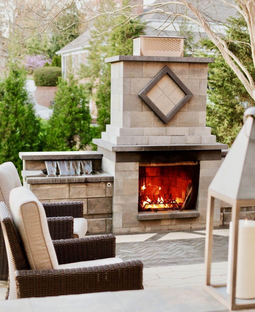 This stone fireplace combines traditional craftsmanship with contemporary flair, featuring a striking diamond-shaped inlay that makes it feel unique while still inviting. Surrounded by wicker lounge chairs in a well-arranged seating area, the fire becomes a natural centerpiece for relaxing with friends on a concrete patio. Perfect for backyards wood burning setups, but also adaptable to gas or electric options, this design strikes the ideal balance between elegance and cozy comfort.