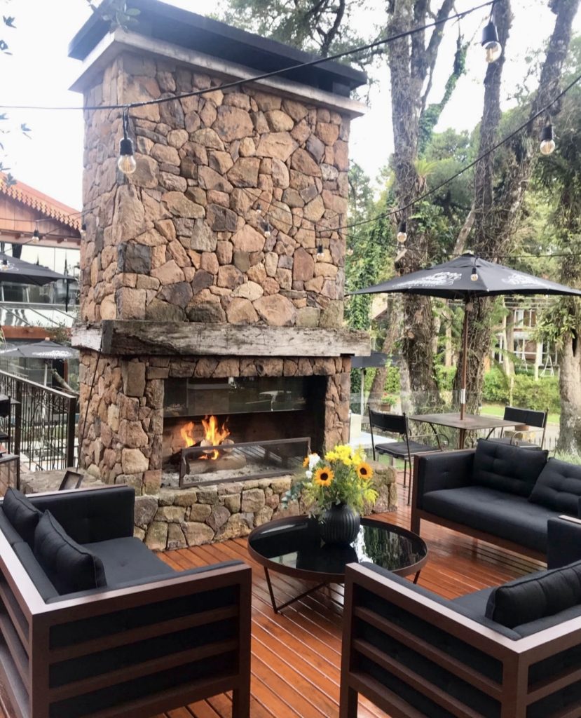 For those who dream of a cabin-inspired escape, this rustic stone fireplace delivers warmth and character in abundance. Constructed with irregular stones and topped with a weathered timber mantle, it feels hand-built and timeless. Surrounded by sleek black outdoor sofas, it demonstrates how old-world texture can coexist with modern furniture for a cozy yet stylish effect. It’s a design idea that would look just as authentic on covered decks or even translated into a minecraft build for creative inspiration.