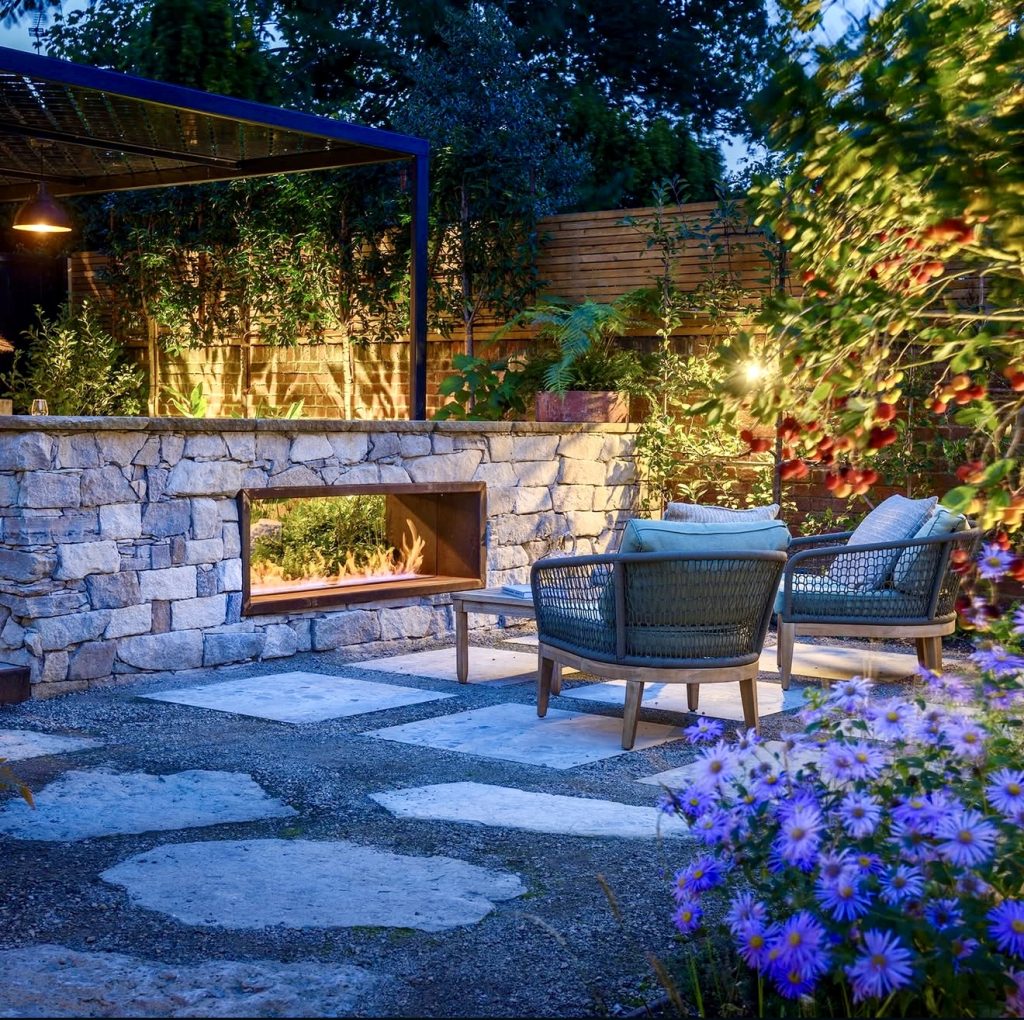 This low-set fireplace offers a unique take on outdoor heating, blending seamlessly into a stone garden wall. The horizontal firebox provides a wide glow, making it perfect for illuminating seating areas without blocking the view of nearby plantings or landscaping. It’s a great fit for modern gardens with concrete patio pathways, and its versatility means it could be adapted to gas or electric installations depending on your preference. With its sleek look and soft ambiance, it’s one of the most cozy designs for intimate gatherings.