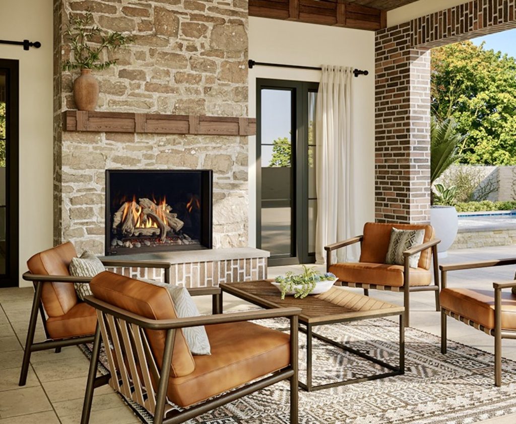 A bold stone structure with a dual-sided flame feature makes this covered lounge feel like a luxury hotel terrace. The contemporary build and clean tile flooring create a polished look, while the bright red cushions inject personality and warmth. Perfect for covered decks in suburban neighborhoods, this layout uses the fireplace as both a visual divider and a unifying element. It’s also practical for chillier evenings—no matter which side you’re seated on, the flickering fire adds that essential cozy ambiance.