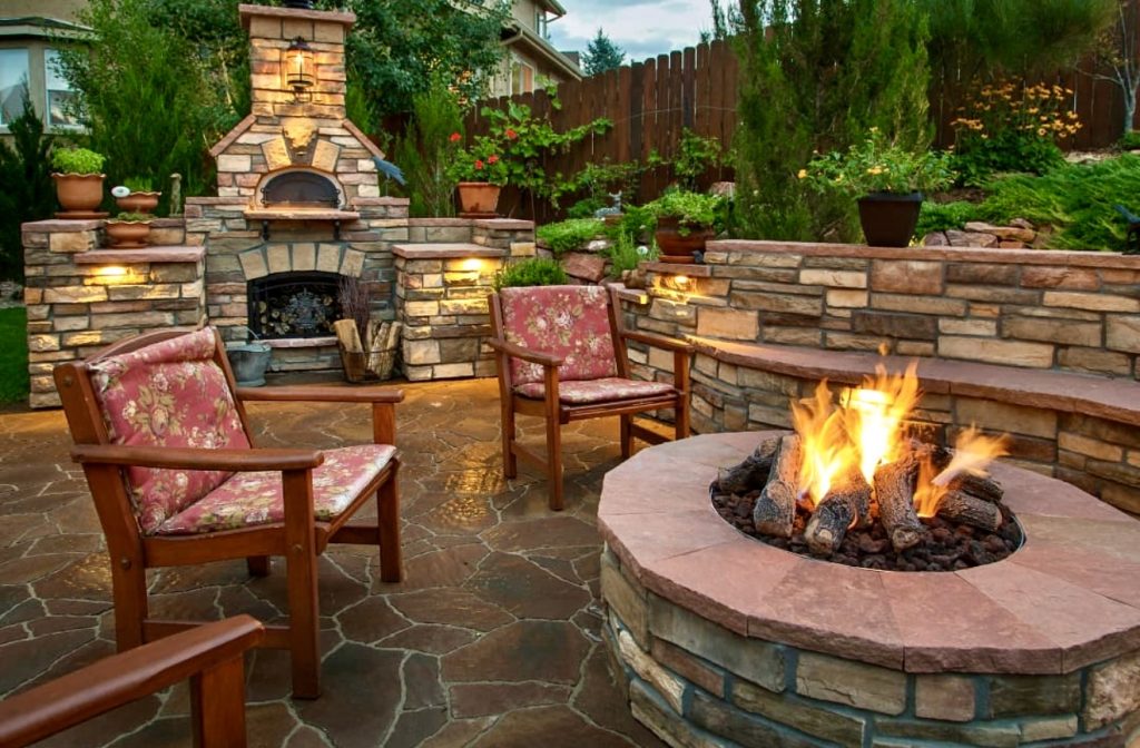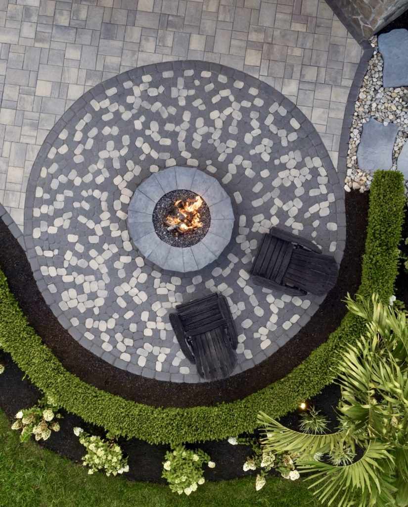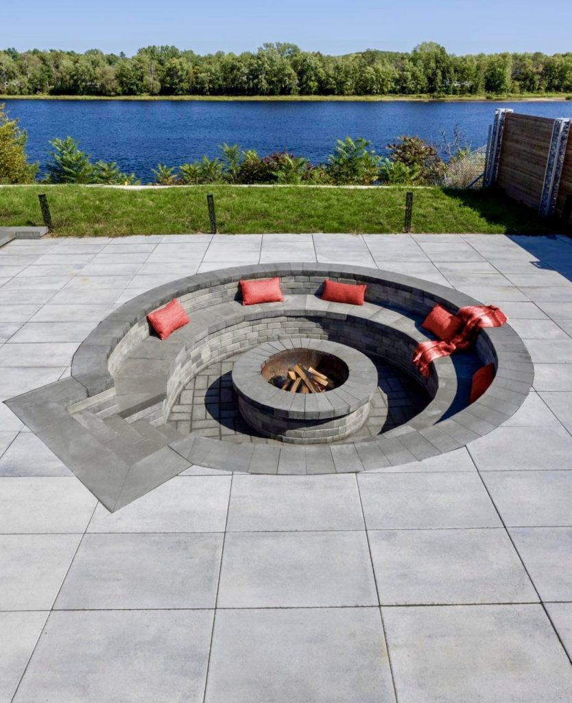 This round fire feature surrounded by intricate stonework is a masterclass in blending texture and form. The combination of darker and lighter pavers creates a rhythmic pattern that draws the eye inward to the flickering flame. It’s a clever way to elevate a simple patio without overwhelming the landscape. Designers often use contrasting stones like this to add movement to concrete patios, giving homeowners a stylish yet low-maintenance solution. Paired with weathered wooden chairs, the setup feels both structured and organic—ideal for late summer nights and year-round entertaining.