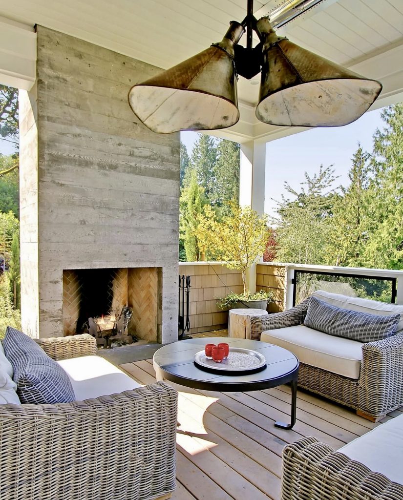 19. Cozy Covered Deck with a Rustic Concrete Chimney