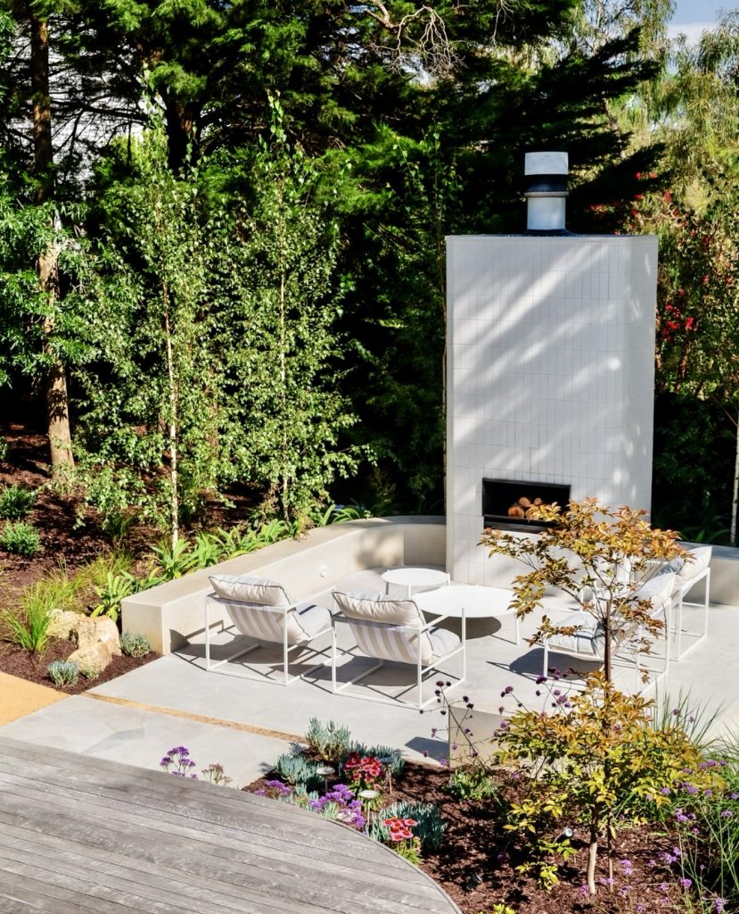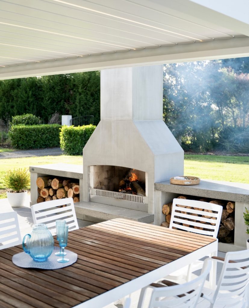 Bright and minimalist design demonstrates how an outdoor fireplace with clean lines elongates a lush surrounding. This modern white structure will act as a calming anchor sphere among the greenery, while the built-in seating ends will reflect a laid-back semicircle for a heart-to-heart conversation. A balance of modern architectural lines to natural textures makes it ideally suited for covered or half-shade patios. Being of neutral color; this setup will allow any seasonal landscaping to shine down-the epitome of sometimes, simplicity can be the loudest statement. Great inspiration for the DIY crew that wants to host the outdoors in that modern way without too much fuss in the build.