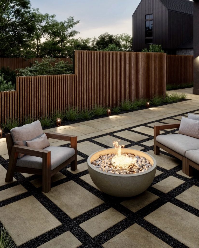 Minimalism meets warmth in this contemporary outdoor setting, where a sleek fire bowl takes center stage on a carefully structured concrete patio. The geometric grid pattern, filled with black gravel, frames the gas fire feature beautifully, creating a visually striking layout that feels straight out of a modern landscape magazine. It’s an elegant option for homeowners who prefer clean lines over rustic charm. With structured seating areas and a natural wood privacy wall, this design offers both intimacy and style—perfect for small backyards that crave a sophisticated edge.
