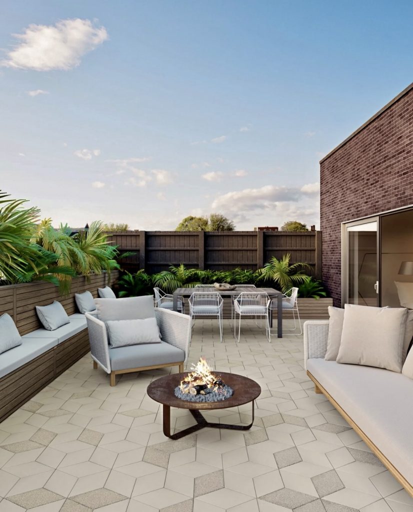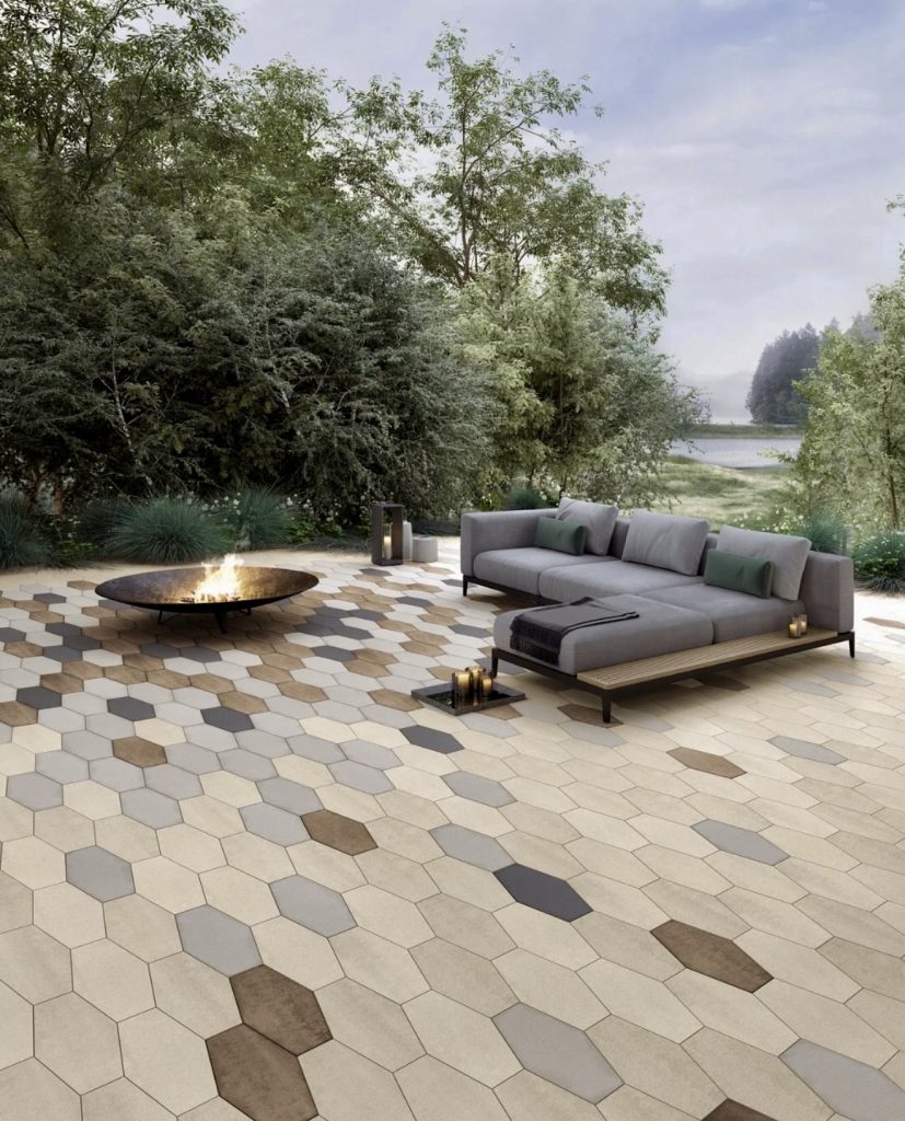 23. Modern Hexagon Tile Patio with Low Fire Bowl