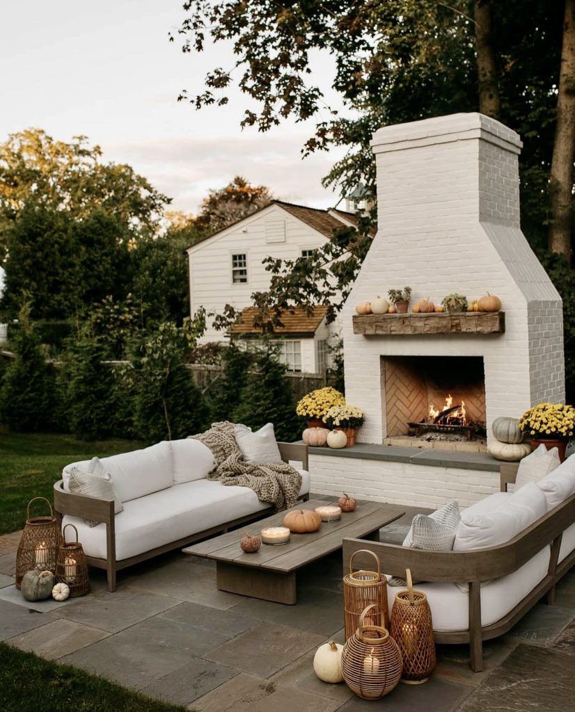 A classic brick structure painted white gives this outdoor fireplace a fresh yet timeless presence. Surrounded by plush sofas and woven lanterns, it creates a cozy focal point that feels just right for fall gatherings. The soft neutral palette allows the stone patio to shine, while layered textures—like chunky throws and wicker—bring warmth. This is a fantastic example of how to blend rustic charm with modern styling, turning backyards into year-round retreats. It’s a style adored by lifestyle bloggers who favor approachable elegance with a touch of seasonal flair.