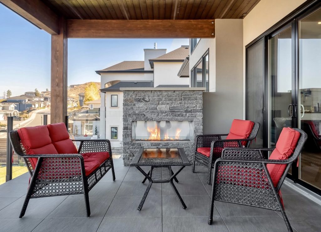 Minimalism is having a moment, and this design proves how powerful it can be. The clean lines of the fireplace, paired with pale wood furniture and neutral tones, give the space a distinctly modern feel. Here, the fireplace doubles as a functional anchor to a complete outdoor setup, including a built-in grill and countertop. This is a smart design choice for anyone dreaming of an outdoor space that can host everything from casual dinners to big celebrations. The crisp stone surround keeps it fresh, while the black firebox adds sharp contrast. With its covered partial roofing, the space blends indoor comfort with outdoor freedom.