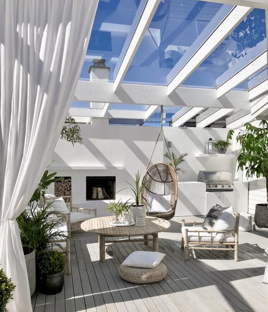 The epitome of modern outdoor living, this sharp fireplace is installed along with a covered deck sporting glass skylights above. With such a clean white structure, light greatly bounces off of it and keeps the entire space airy while still allowing for feelings of coziness. Hanging rattan chairs, modern seating, and plenty of greenery come together to create a chill yet polished feel. This design is a testament that fireplaces need not even be confined to backyards — they may find a home in all sorts of semi-enclosed spaces such as screened porch configurations. Here, this fireplace is also electric-friendly, implying that it is a smart choice for homeowners in the city, just as it is for suburbanites. With a little bit of styling, this becomes an ideal retreat throughout the year, equally at home sipping morning coffee or evening cocktails.