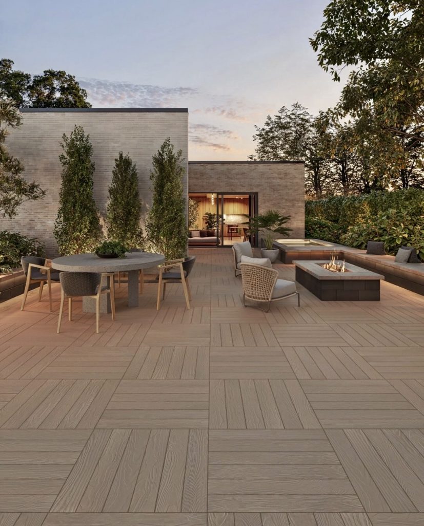 Geometric modern tiling is stealing the spotlight in 2026, and this hexagonal concrete patio layout proves why. By mixing earthy tones with sleek grays, the flooring creates a dynamic foundation for the low-set fire bowl, making it a natural gathering point. This design leans into European-style outdoor living, where the fireplace acts as both decor and ambiance rather than a towering structure. Paired with a low sectional, it’s a perfect example of how contemporary design can soften outdoor spaces, making them as inviting as indoor living rooms.