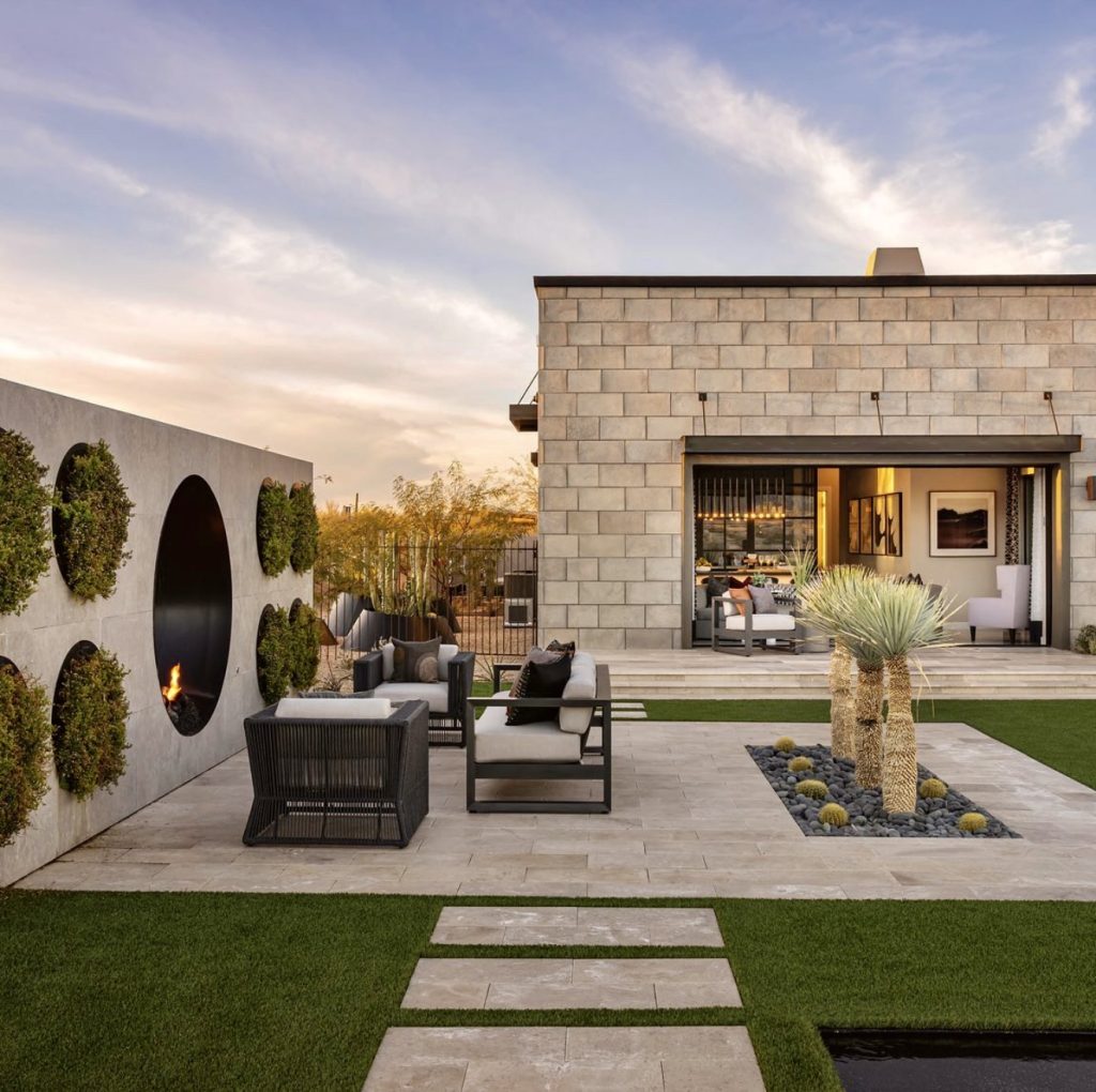 For those craving something bold and unexpected, this fireplace built into a concrete patio wall delivers a unique take on outdoor design. The large circular opening feels like a sculptural statement, while the surrounding built-in greenery adds life and softness. Paired with sleek, low-profile furniture and desert landscaping, the vibe is distinctly modern and architectural. This is the kind of fireplace that resonates with fans of platforms like Bloxburg or even minecraft, where design leans into imagination and creativity. Minimalist yet striking, this concept proves that an outdoor fireplace doesn’t always have to be traditional — it can be a work of art that defines the entire backyard experience.