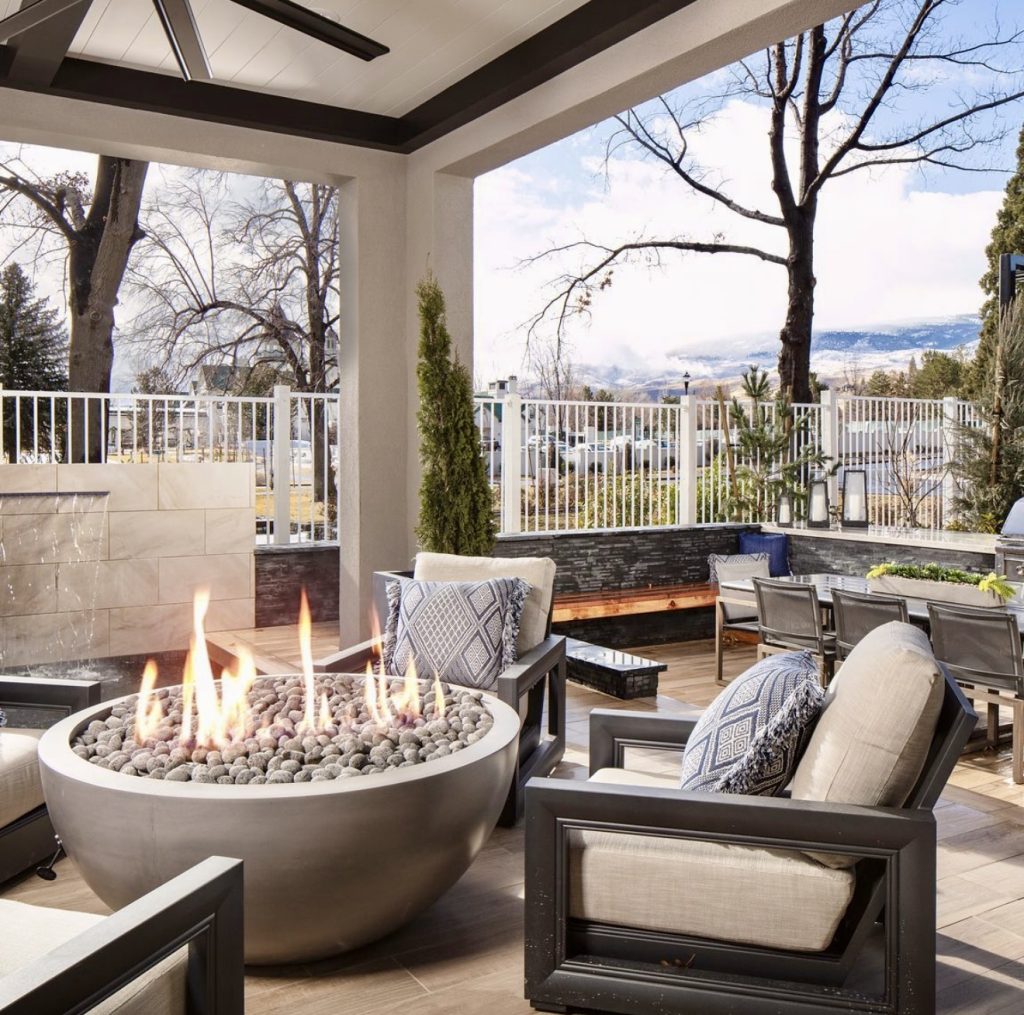 This design shows how a round gas fireplace can redefine outdoor comfort. The smooth concrete bowl filled with lava stones creates a sleek focal point while radiating just the right amount of heat. It’s ideal for covered decks, where protection from the elements allows you to use the space year-round. The arrangement of cushioned chairs around the fire encourages conversation, turning the area into a stylish lounge. For homeowners looking for a low-maintenance option, a gas fire feature like this balances modern convenience with an inviting cozy atmosphere.