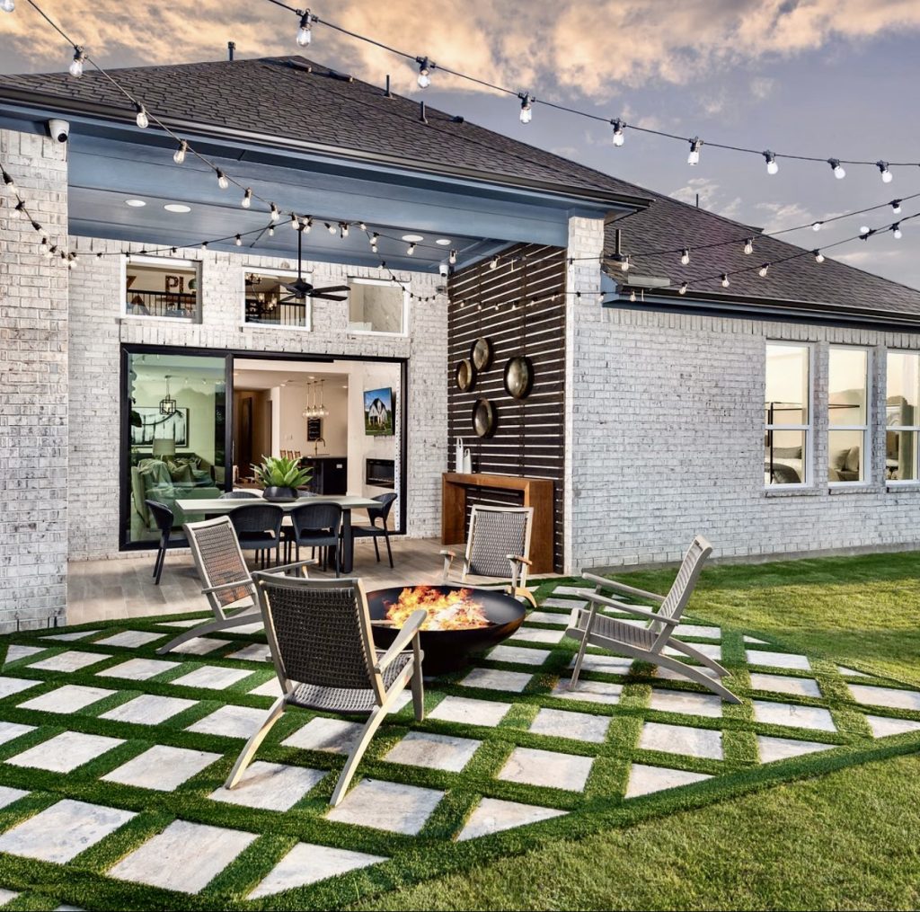 This setup brings a playful twist to backyards, blending a geometric concrete patio design with a central fire bowl. Overhead string lights enhance the mood, proving that even simple diy projects can create an unforgettable environment. The seating areas are arranged for flexibility, making it easy to transition from family dinners to late-night conversations. This is also the kind of layout that resonates with the Bloxburg generation, where digital inspiration meets real-life curb appeal. A fire bowl like this can run on gas or wood, depending on preference, and remains one of the most budget-friendly ways to bring a fireplace feel outdoors.