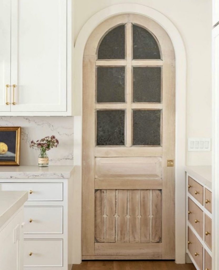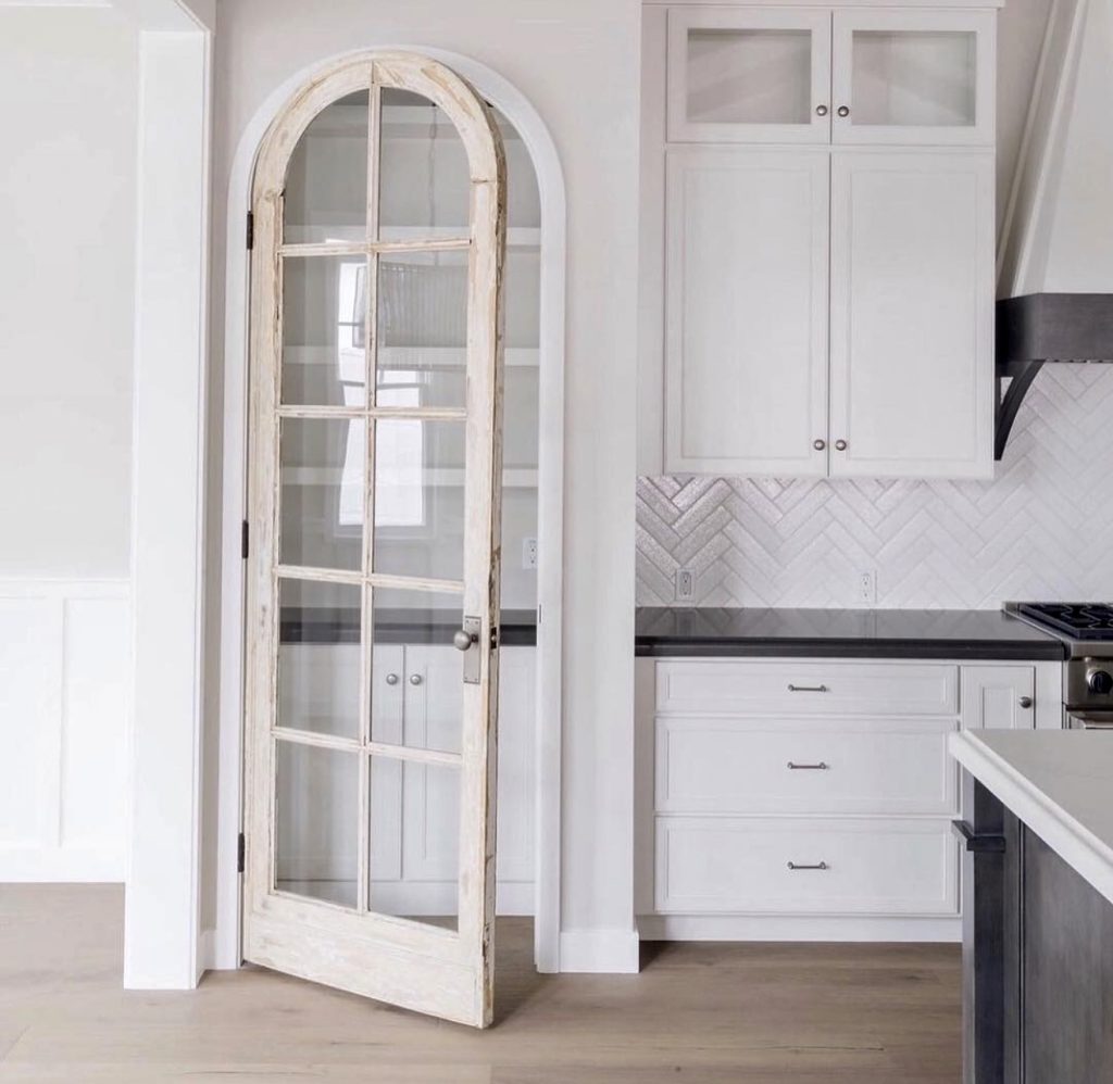 Here, the pantry becomes a true focal point thanks to the dramatic arched silhouette—a feature that continues to trend strongly into 2026. The slender glass grids and brushed-off frame make the door feel lovingly salvaged, almost like a secret architectural treasure discovered during a renovation. When paired with clean shaker cabinetry and modern surfaces, it creates an unforgettable contrast, bridging old-world craftsmanship with contemporary living. Homeowners looking for standout ideas for kitchen upgrades will find this shape transformative, especially in homes where every detail counts.