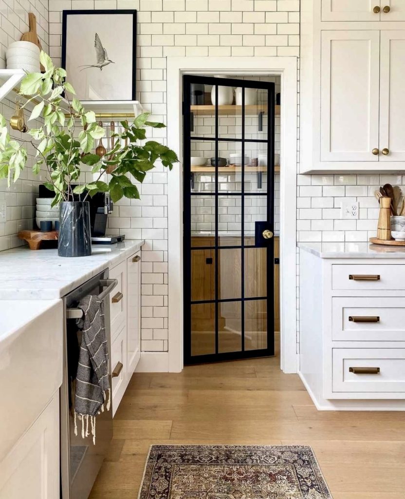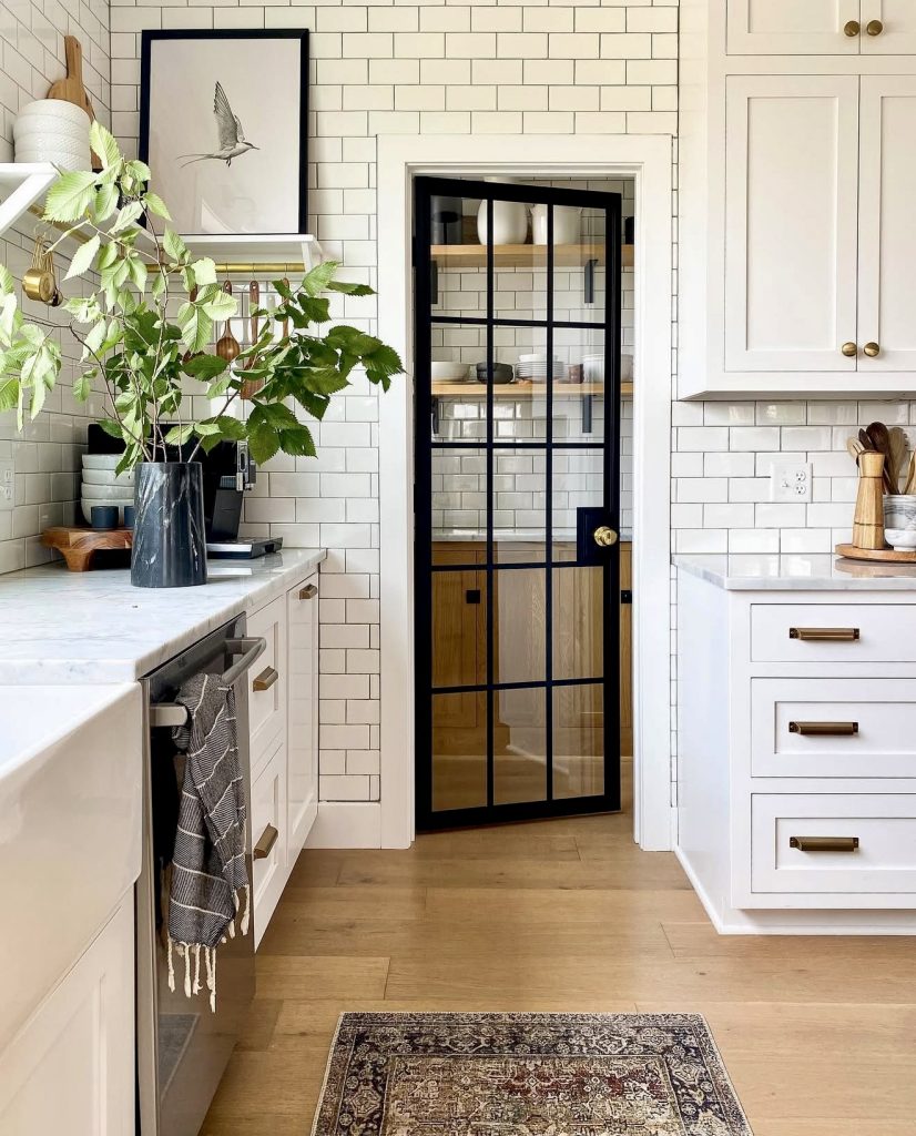 This striking design shows how a slim-profile black-framed door with full glass panels can instantly elevate a light, subway-tiled kitchen. The grid pattern adds architectural definition without feeling heavy, making it perfect for homeowners who want a crisp, modern look but still appreciate warmth from natural wood shelving behind the door. This style has become a 2026 favorite among designers because it blends contemporary lines with a touch of industrial charm, and it works beautifully in both small and large spaces. It’s also one of the easiest ways to give a pantry a subtle makeover that feels custom and intentional.