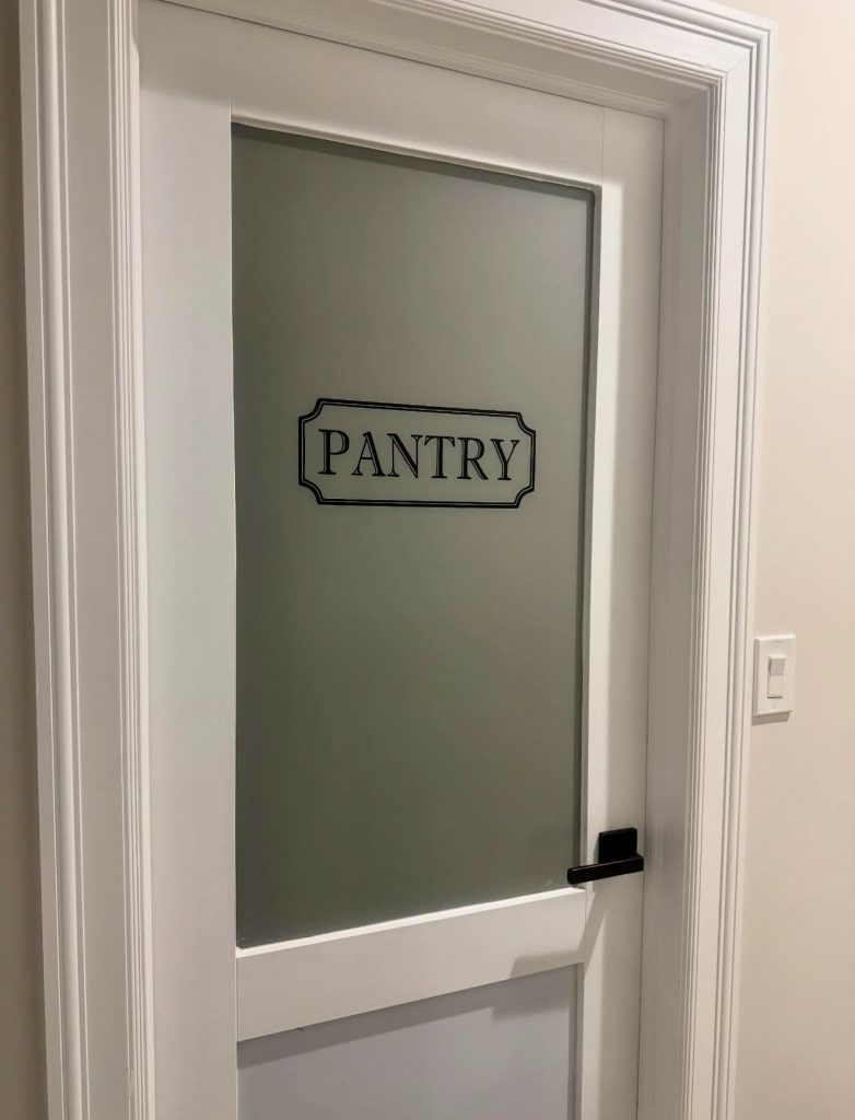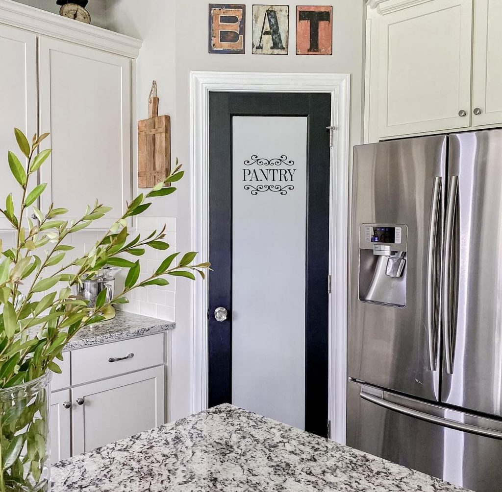 This door embraces a crisp, graphic style that works well in smaller spaces where clarity and contrast matter. The dark frame highlights the central frosted glass insert, giving the pantry a clean, organized feel while keeping its contents subtly hidden. The typography adds a playful, café-inspired touch—something many American homeowners love because it feels personal and approachable. It’s a great example of how a quick makeover can shift the mood of the entire kitchen, proving that even modest updates can deliver a big style return.