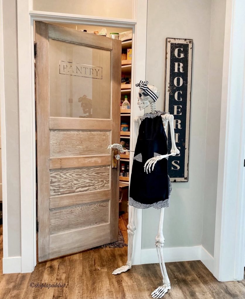 This warm wooden pantry door includes frosted center glass and a softened finish that leans into farmhouse-style ideas, but what makes it unforgettable is the playful styling around it. The door has a slightly weathered, rustic appearance that adds character, while the vintage-inspired pantry label keeps things charming and practical. Homeowners across the U.S. increasingly add personality into pantry entrances—sometimes humor, sometimes seasonal decor—which reflects a bigger shift toward making utilitarian spaces feel lively and lived-in. This door proves that even small design decisions can bring joy into everyday routines.