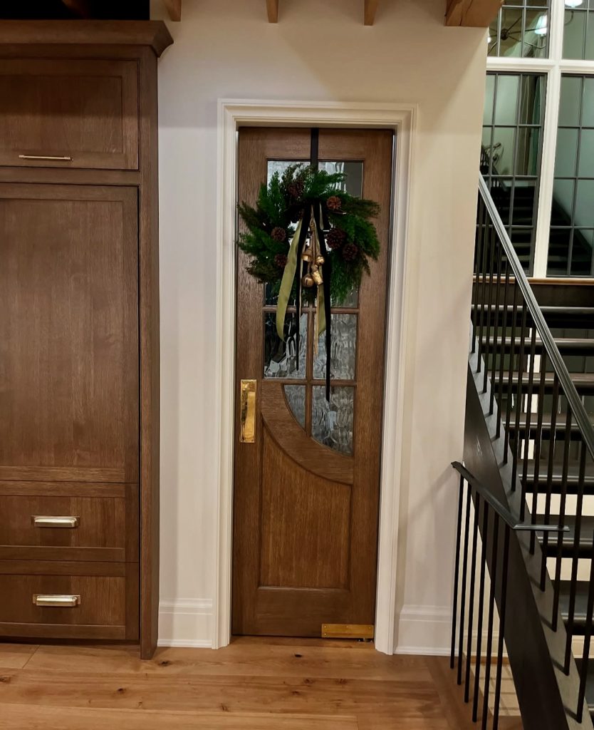 For those who gravitate toward the farmhouse-style idea, this pantry door captures the inviting charm that defines the trend. The soft wooden grain paired with clear glass keeps the look airy, while the wreath introduces a welcoming, lived-in character that suits both modern farmhouse and transitional homes. This kind of door complements shaker cabinetry, warm metals, and black hardware beautifully, making it an easy fit for a wide range of U.S. households. It also demonstrates how seasonal décor can turn a simple entry into a joyful, expressive moment.