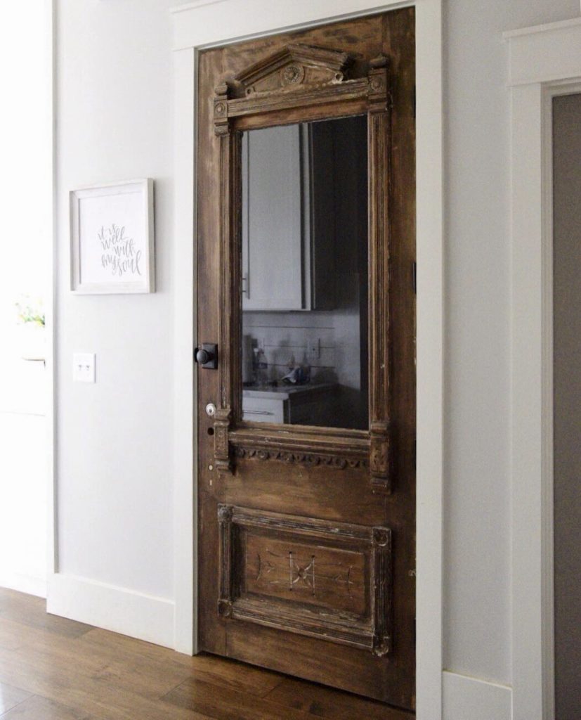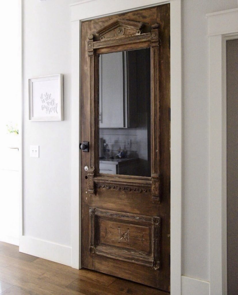 This ornate antique pantry door is a statement piece for homeowners who view design as storytelling. Hand-carved trim, a dramatic pediment, and aged wood create a sense of heritage—almost like the door was salvaged from a European manor. The inset glass offers visibility, while the craftsmanship adds the kind of depth modern builders rarely replicate. Designers often talk about “one moment of history” in new-build homes, and an antique door like this delivers exactly that. Whether paired with classic white cabinetry or deeper moody tones, it anchors the space with artistry and character.