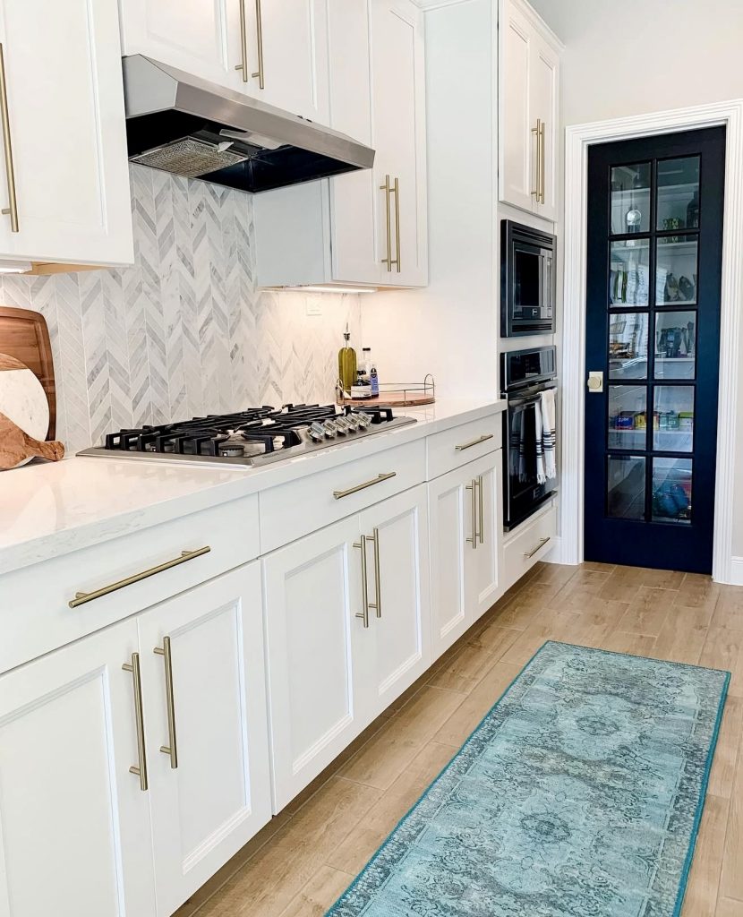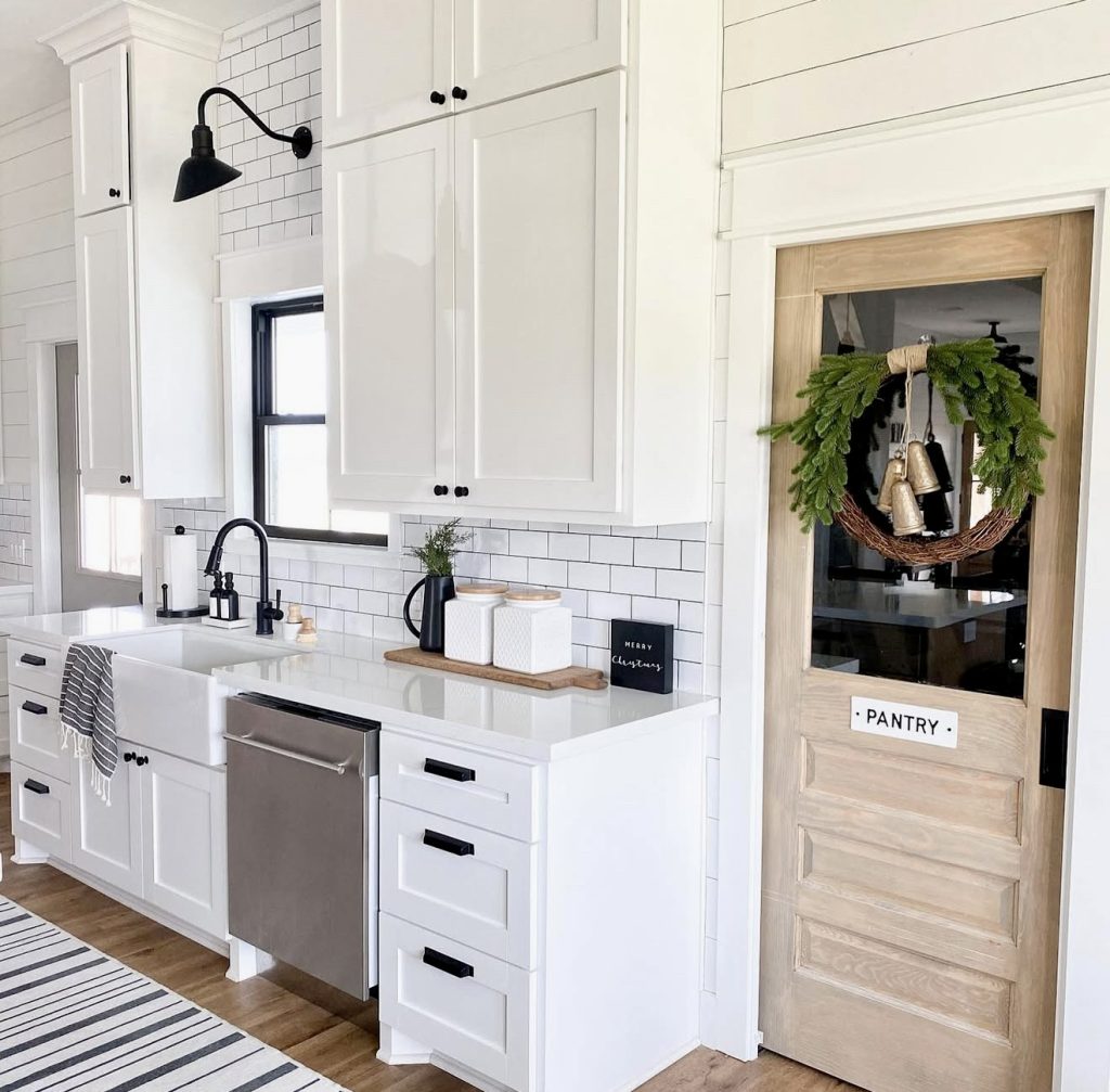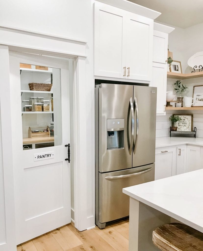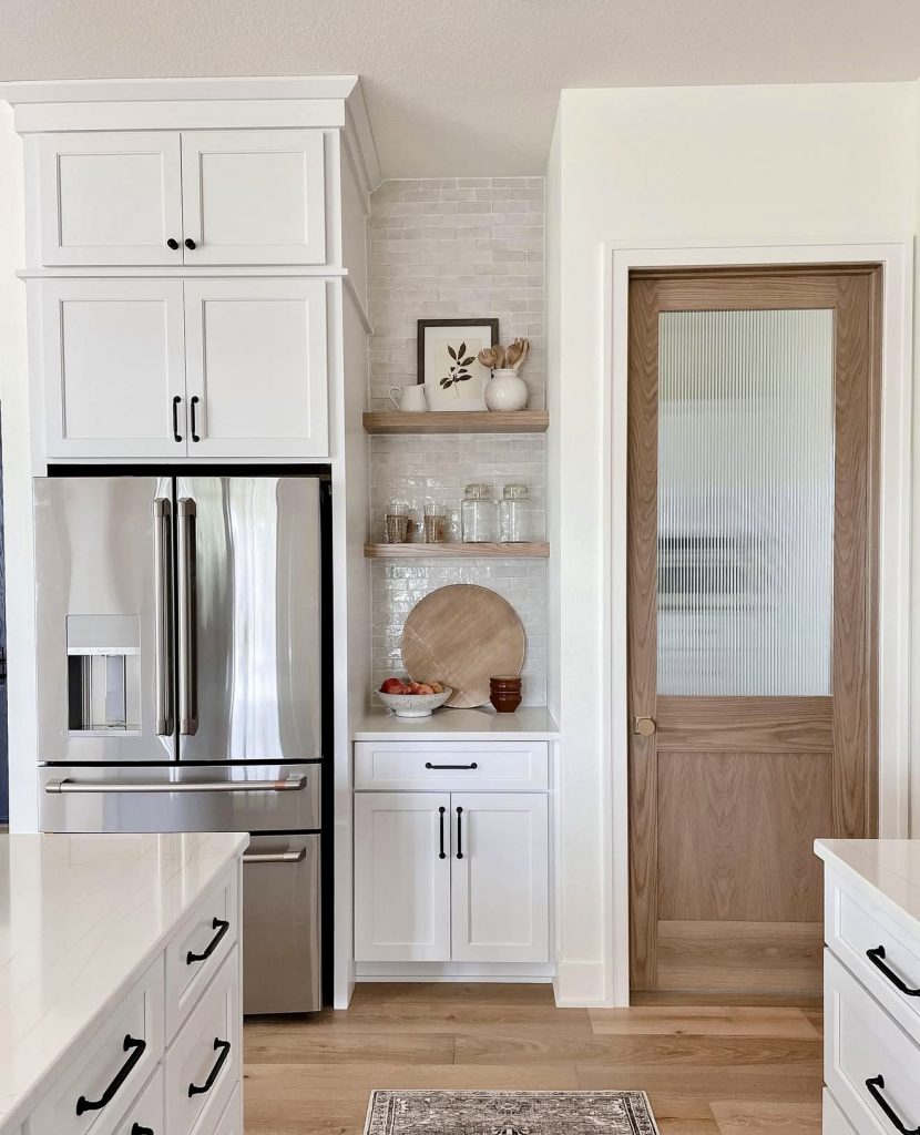 This warm wooden door brings a natural counterbalance to the crisp white shiplap walls surrounding it. The large glass inset offers visibility without sacrificing charm, and the dark iron hardware enhances the door’s timeless appeal. The design fits beautifully into transitional or farmhouse-inspired homes where texture and authenticity are prized. It’s a solid reminder that even in a simple kitchen, the pantry door can become a focal point—especially when its finish echoes the tones of the flooring and other wooden accents.