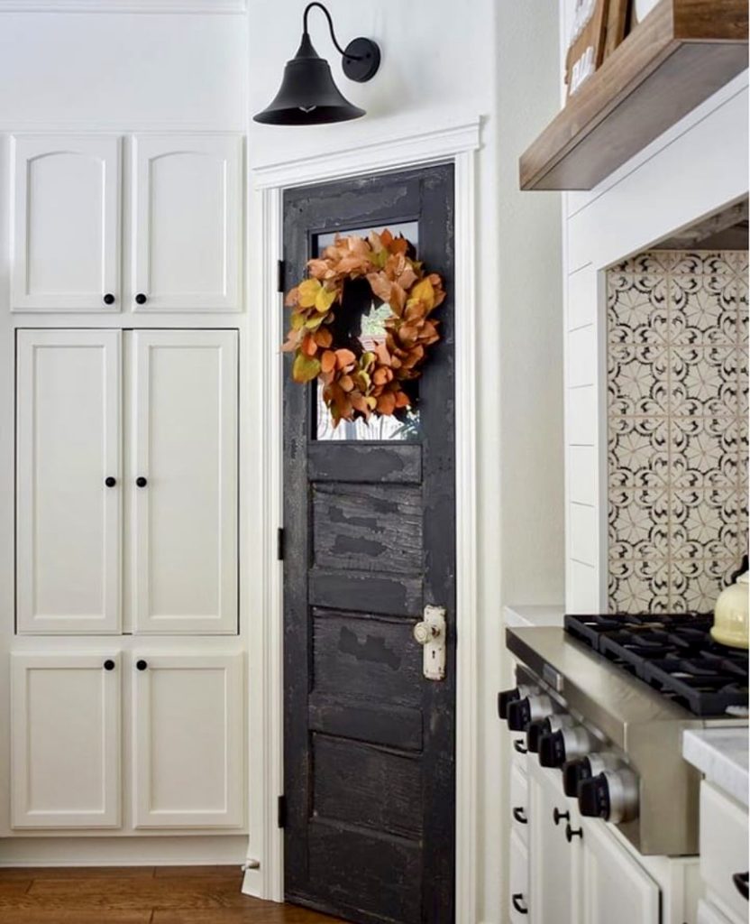 This heavily distressed teal door is the epitome of rustic farmhouse character—its peeling paint, original hardware, and inset glass panel create a look that feels lovingly salvaged. The soft turquoise tone adds a cheerful pop of color to the neutral kitchen palette, proving that a pantry door can serve as both a functional entry and a decorative accent. The wreath adds seasonal personality, but the door itself carries enough charm to stand alone year-round. It’s a perfect example of how repurposed architectural pieces can transform modern homes with texture, patina, and authenticity.