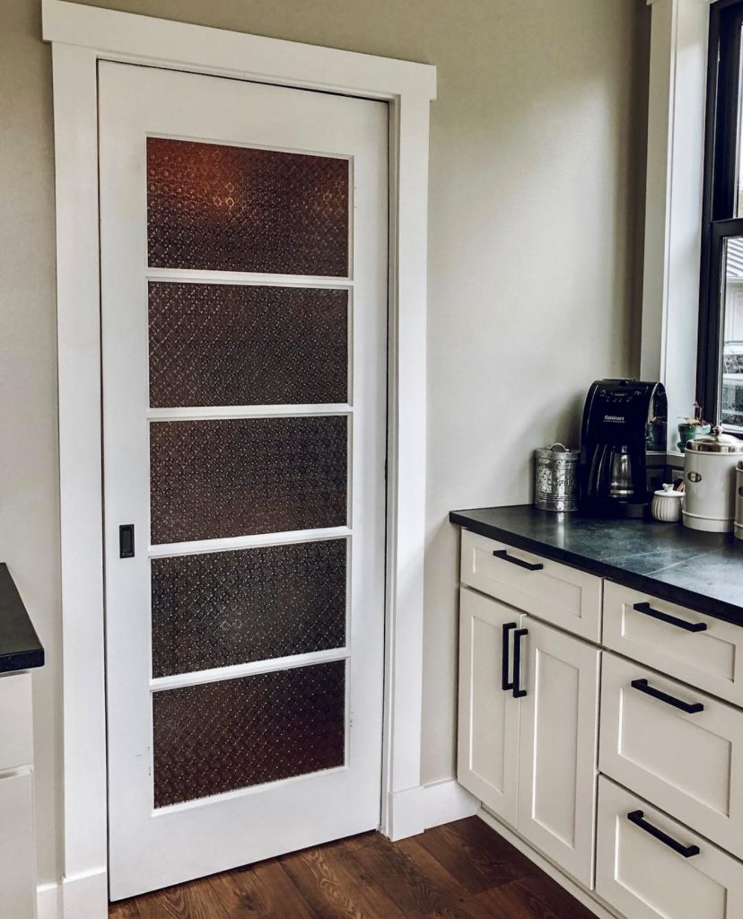 This clean-lined door features four stacked panes of patterned frosted glass, giving the pantry privacy while still allowing light to spread naturally throughout the room. Because it’s a pocket design, it’s especially appealing for smaller homes or tight walkways where a swinging door might disrupt the flow. The subtle texture in the glass adds a distinctive touch—something you often see in historic renovations—while the crisp white frame keeps everything feeling modern and bright. It’s a smart example of function meeting style, perfect for homeowners looking for upgrades that are both beautiful and practical.