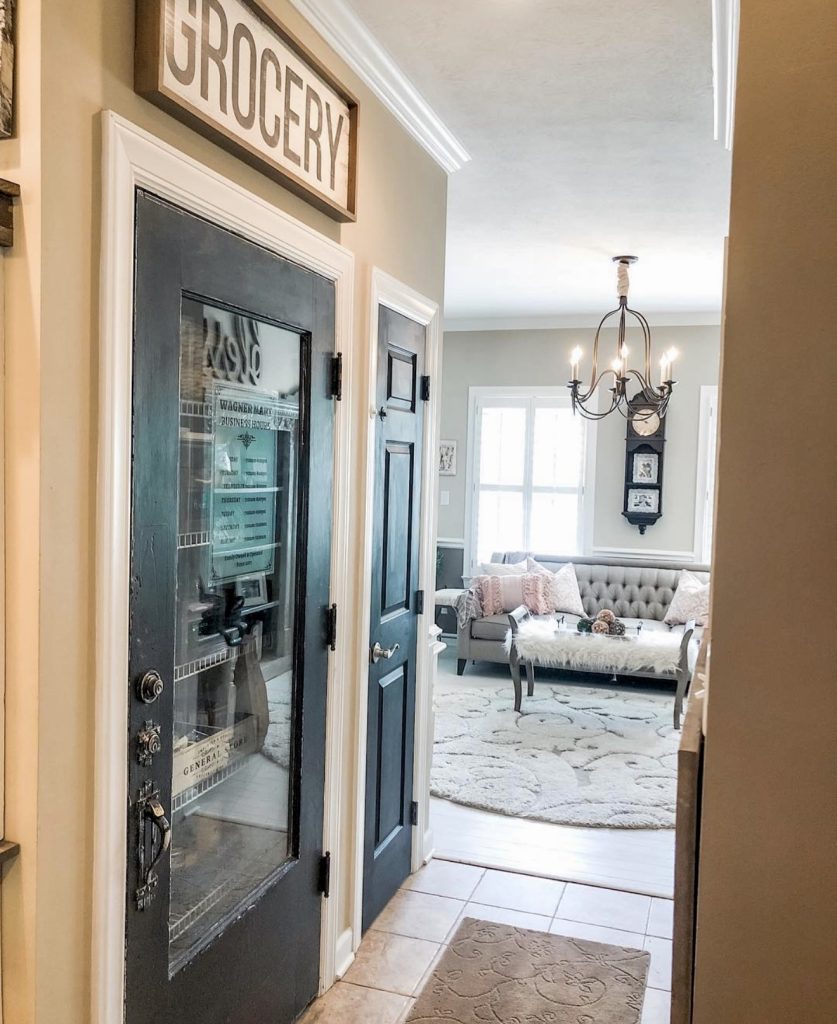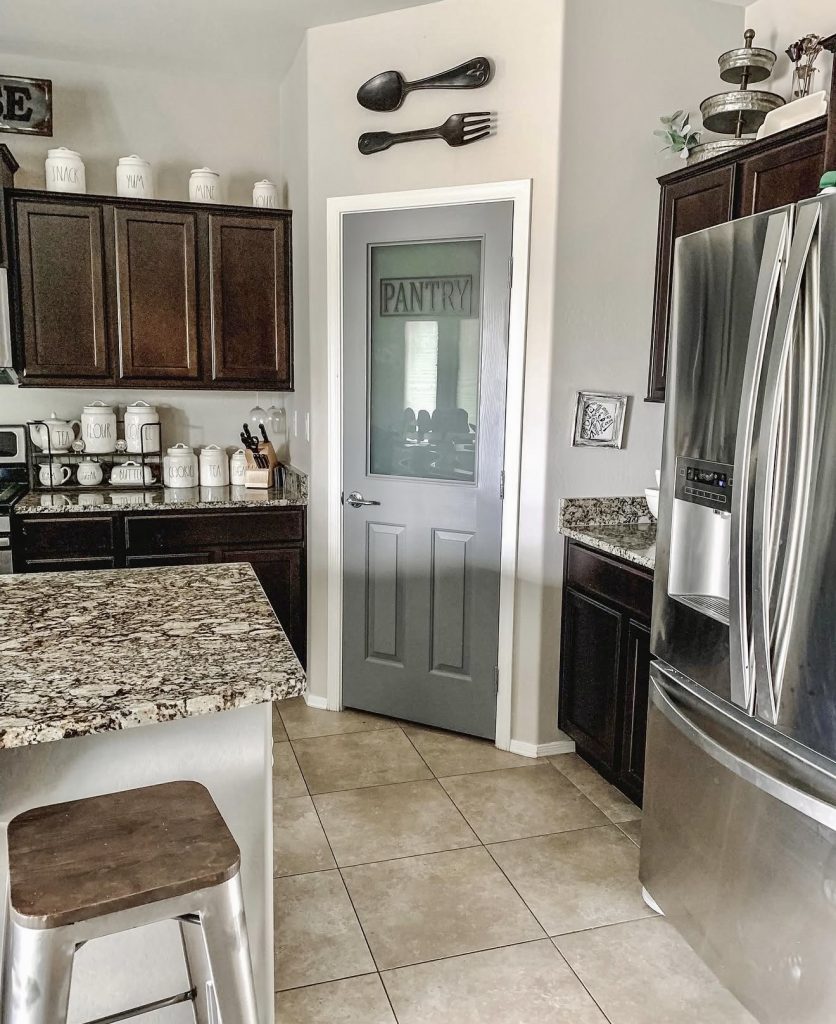 This gentle gray pantry door strikes an ideal balance between modern simplicity and cozy everyday living. The muted color gives the kitchen a calm, grounded feel, while the frosted glass panel with the pantry label adds subtle character without revealing the contents beyond. It’s a smart choice for homeowners who want a touch of personality but prefer a cleaner, more understated aesthetic than decorative wood or ornate trim. Paired with stone countertops and darker cabinetry, the door creates a harmonious contrast that feels thoughtfully curated.
