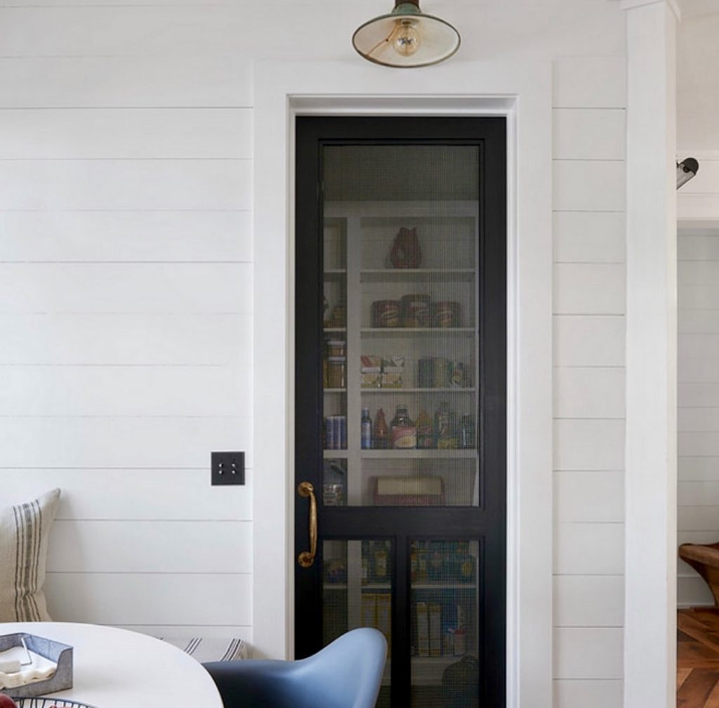 This pantry entrance reimagines the classic screen door in a sleek, modern black version, blending farmhouse nostalgia with minimalism. The fine mesh creates a semi-private effect while functioning almost like frosted material—allowing muted glimpses of the pantry without full visibility. The elongated brass handle introduces warmth and sophistication, elevating what could have been a purely rustic feature into something more refined. It’s a great choice for those wanting ideas for kitchen solutions that feel airy, casual, and intentionally unfussy.