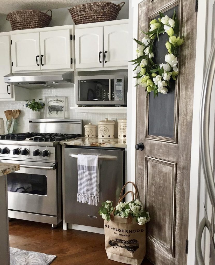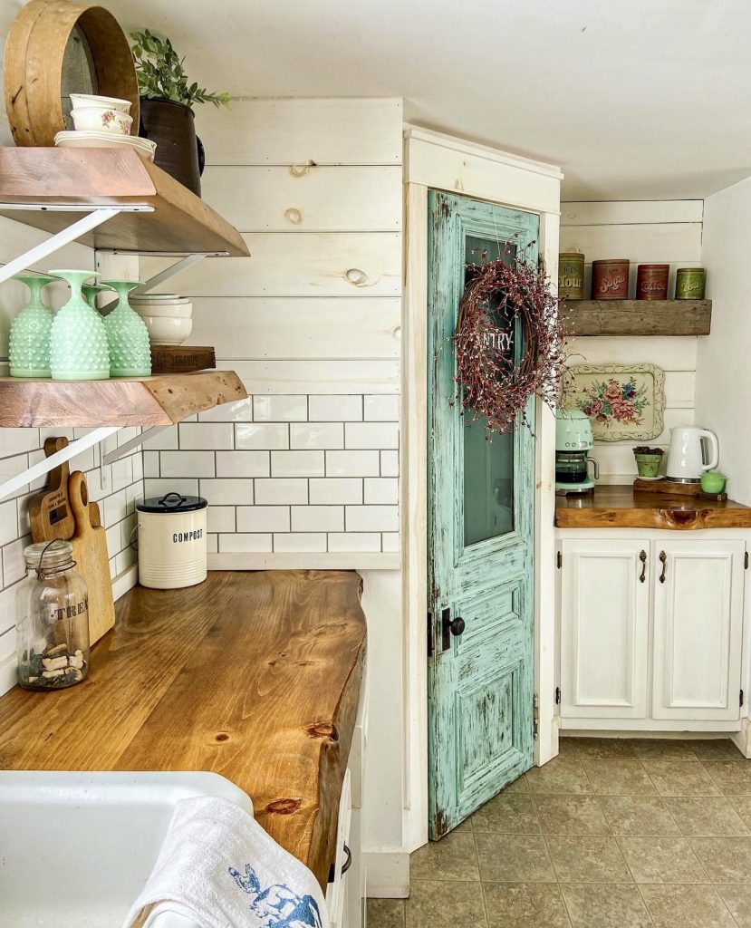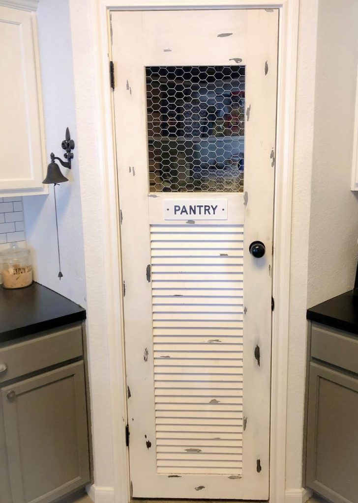 A pantry door like this speaks directly to those who love the farmhouse style and warm, lived-in decor. The distressed finish and chalkboard center create a truly rustic charm—practical yet delightfully decorative. It’s the kind of detail Joanna Gaines fans adore, because it brings personality into the kitchen without feeling forced. A chalkboard insert also becomes a functional organizer for family grocery lists or seasonal greetings. Updating an older home with a door like this is an easy, budget-friendly makeover that keeps the soul of the space intact.