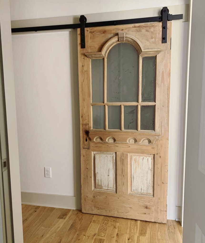 This barn-style door blends sliding functionality with the charm of an antique architectural piece. The arched top panel, divided glass, and hand-carved details create a storied look—almost as if the door was salvaged from a historic estate. Mounted on a modern track, it becomes a striking hybrid of old and new, making it a standout element in any pantry area. Sliding doors like this have surged in popularity for homeowners who want to maximize space and add high-impact design without altering their kitchen footprint.