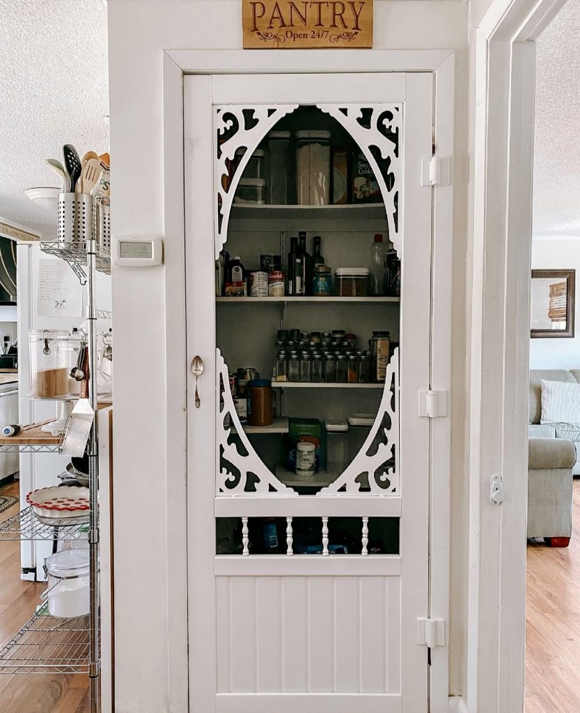 This playful entry leans fully into vintage cottage charm with ornate trim, carved scrollwork, and a delicate glass opening that provides a peek into the pantry’s shelves. The detailing feels lovingly handmade, the kind of feature you might discover in a well-preserved Victorian home. It adds softness and whimsy to the surrounding space, proving that a pantry door doesn’t need to be simple to be functional. For homeowners who love decorative accents and historic character, this design captures the heart of earlier eras while still working seamlessly in modern life.
