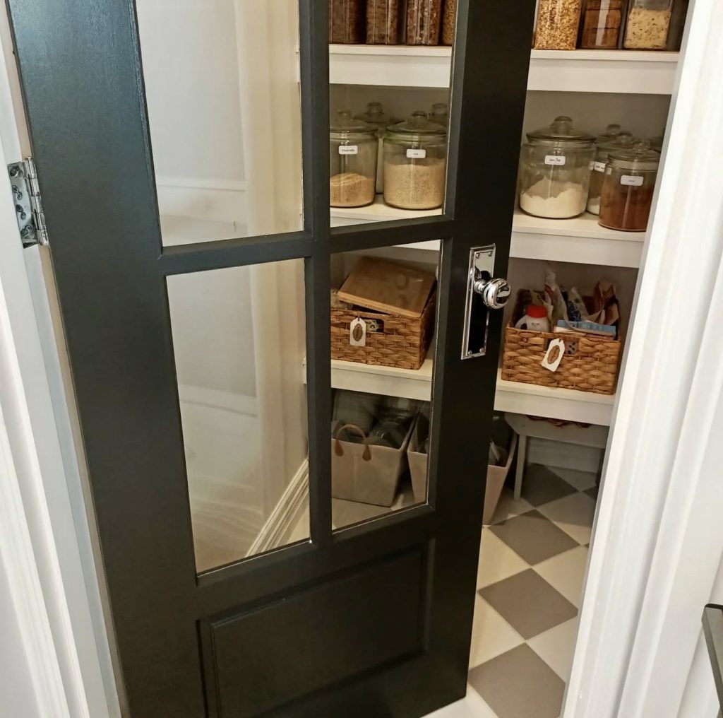 This design captures the essence of today’s modern-transitional kitchen, blending clean lines with warmth. The bold black frame and expansive glass panels bring a sense of openness, allowing a peek into beautifully styled shelves without overwhelming the space. It’s the kind of door that instantly elevates a room and feels almost architectural, echoing the popularity of steel-frame interiors seen in boutique restaurants and loft remodels. The look works especially well when homeowners want a subtle makeover without construction—simply replacing the pantry door with a grid-style design introduces contrast, sophistication, and plenty of visual depth.